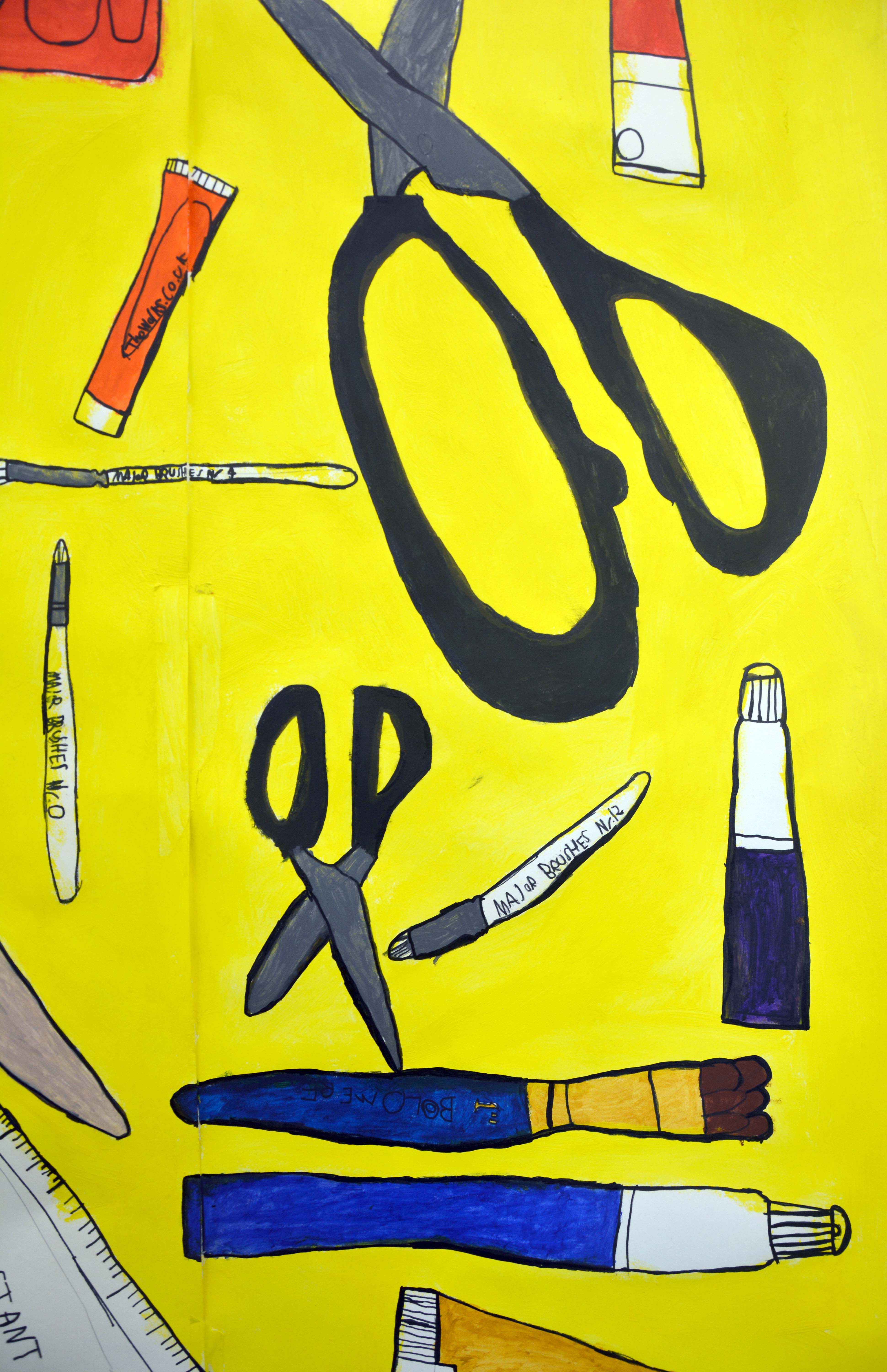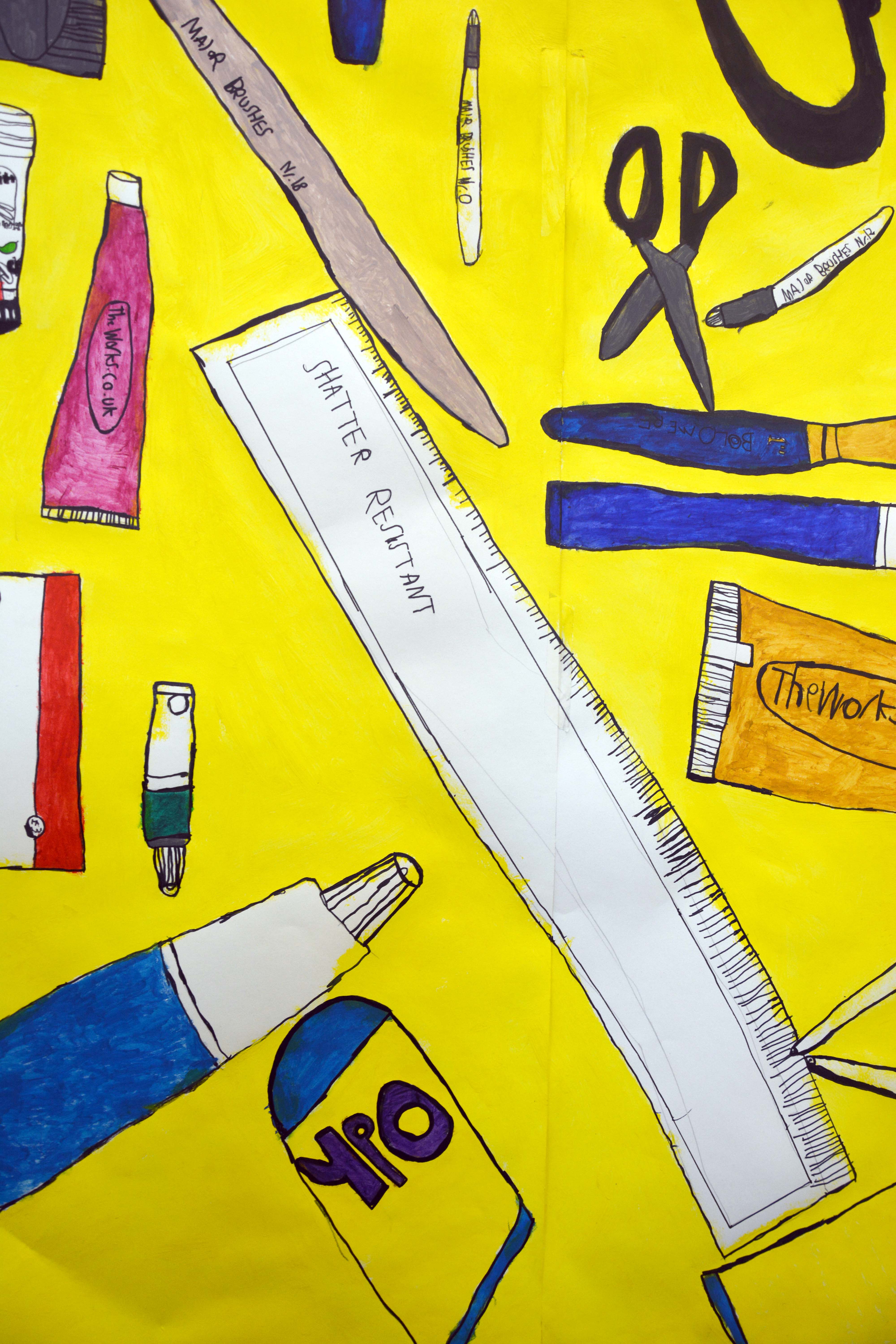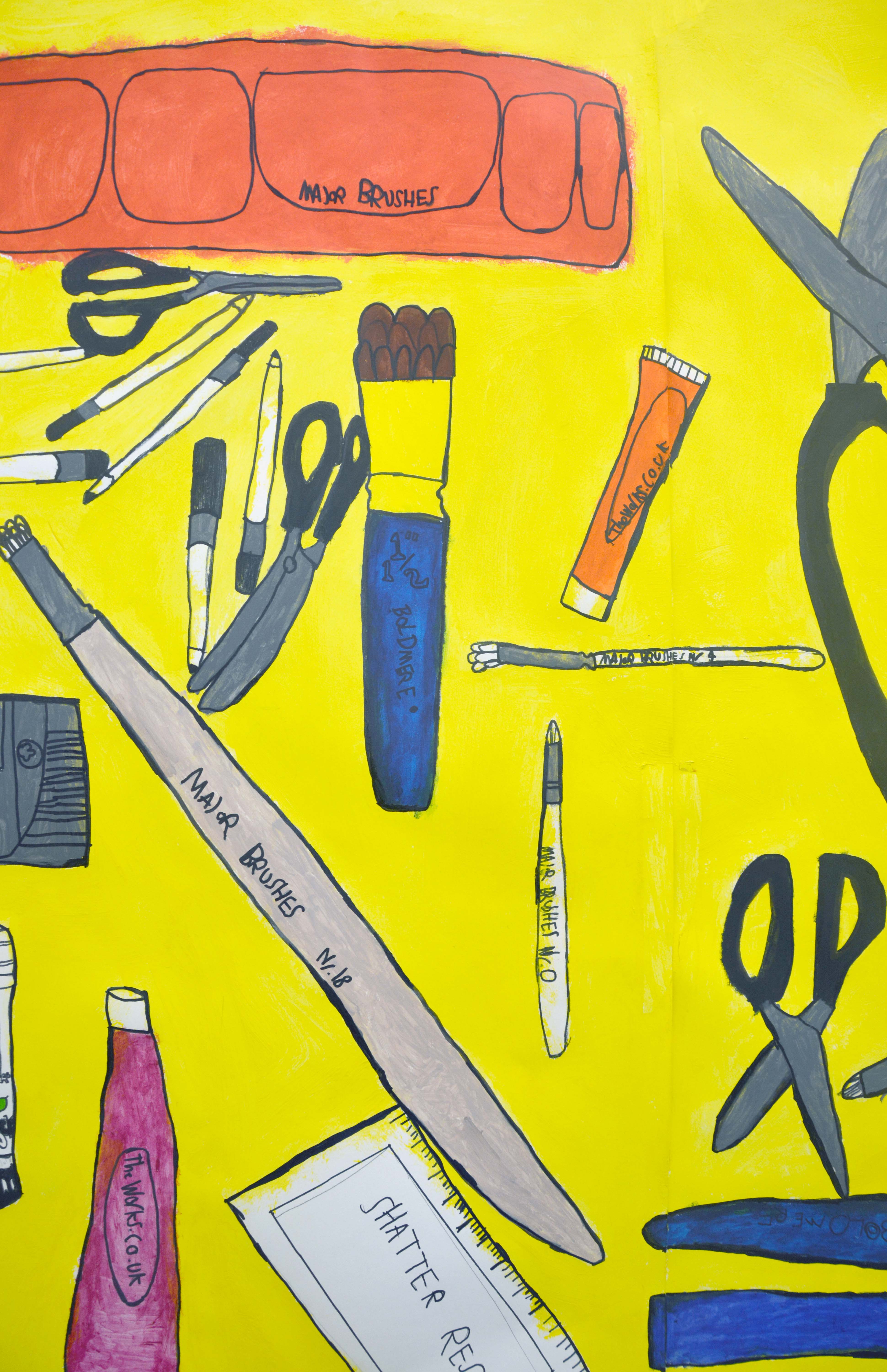Using large rolls of paper I began to outline and sketch my everyday objects on a large scale, I decided to draw the items that I used the most during my Art & Design lessons such as pencils, rubbers, sharpeners, glue and paintbrushes. Once the outline was complete I added the bright, eye-catching yellow as a background and proceeded to use my acrylic paints to add detail and colour to the individual everyday objects."