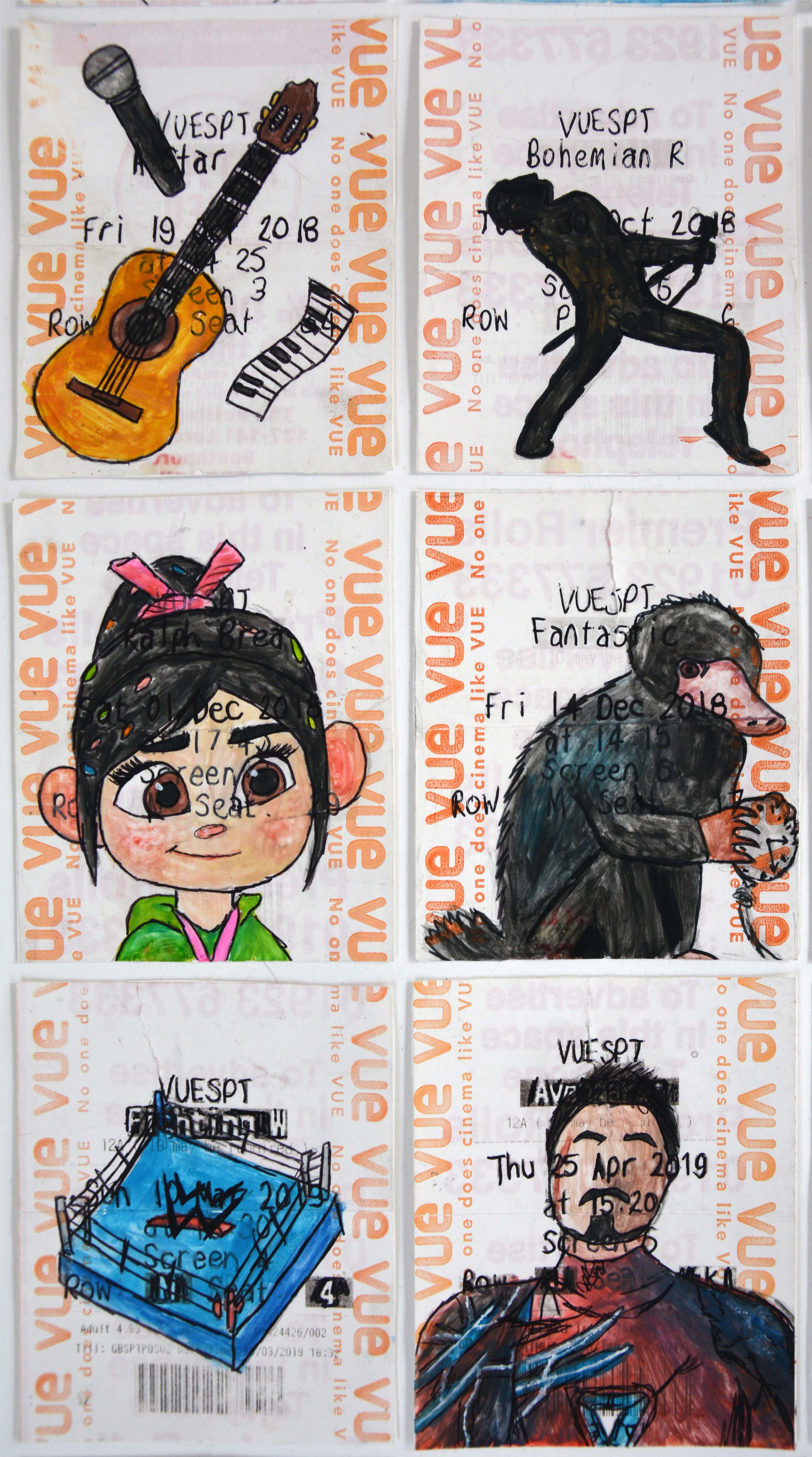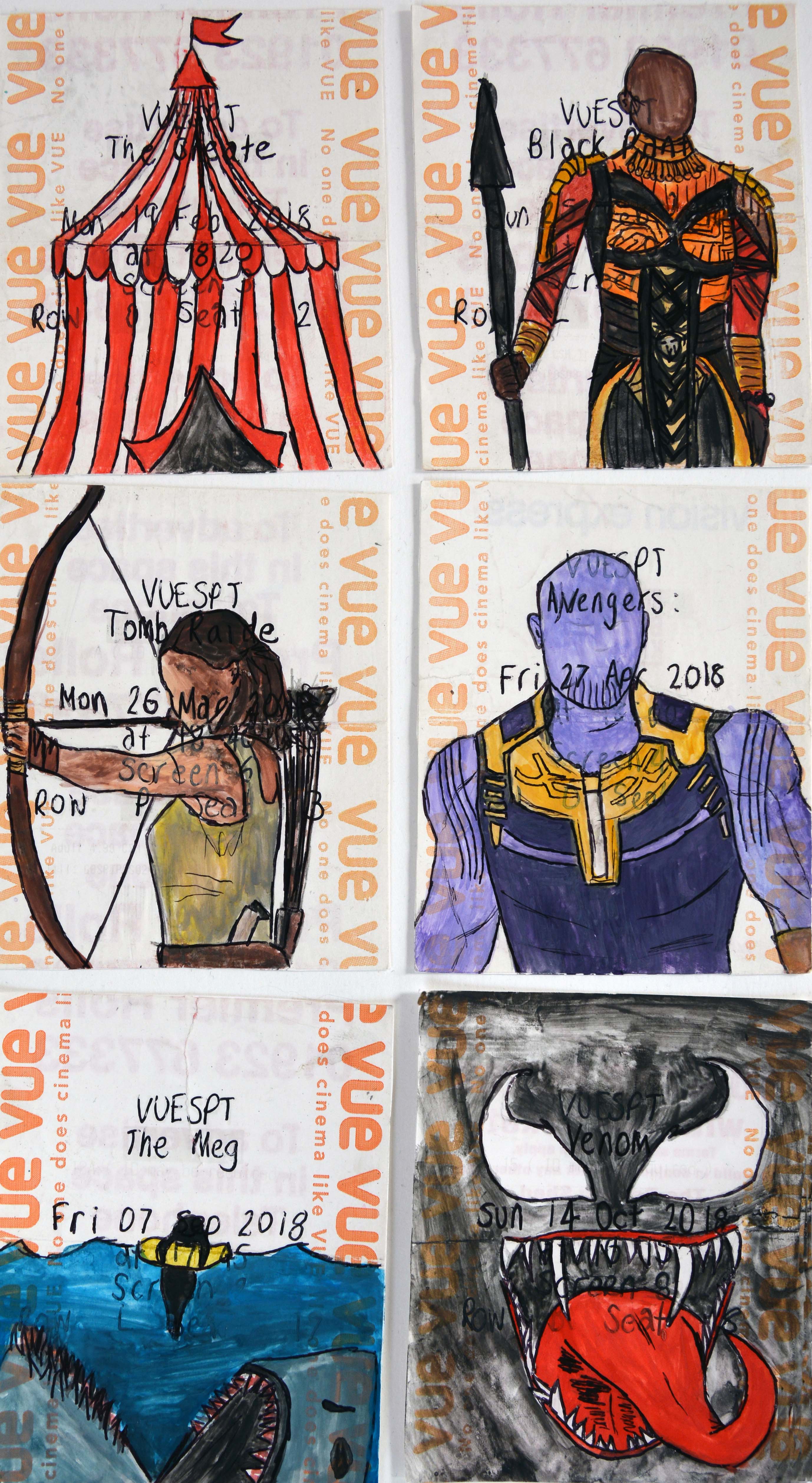 "My final piece was inspired by films and how much I love to go watch and experience new films in the cinema. For my final piece I used a combination of tickets that I have collected since the start of 2018 to form a base for my paintings. The characters and vibrant colours from some of the movies inspired colour palette for my mini paintings. I used watercolour markers as well as a watercolour palette. I sketched out thumbnails for each of my unique paintings in my sketchbook before drawing and painting the final outcomes on each ticket.
