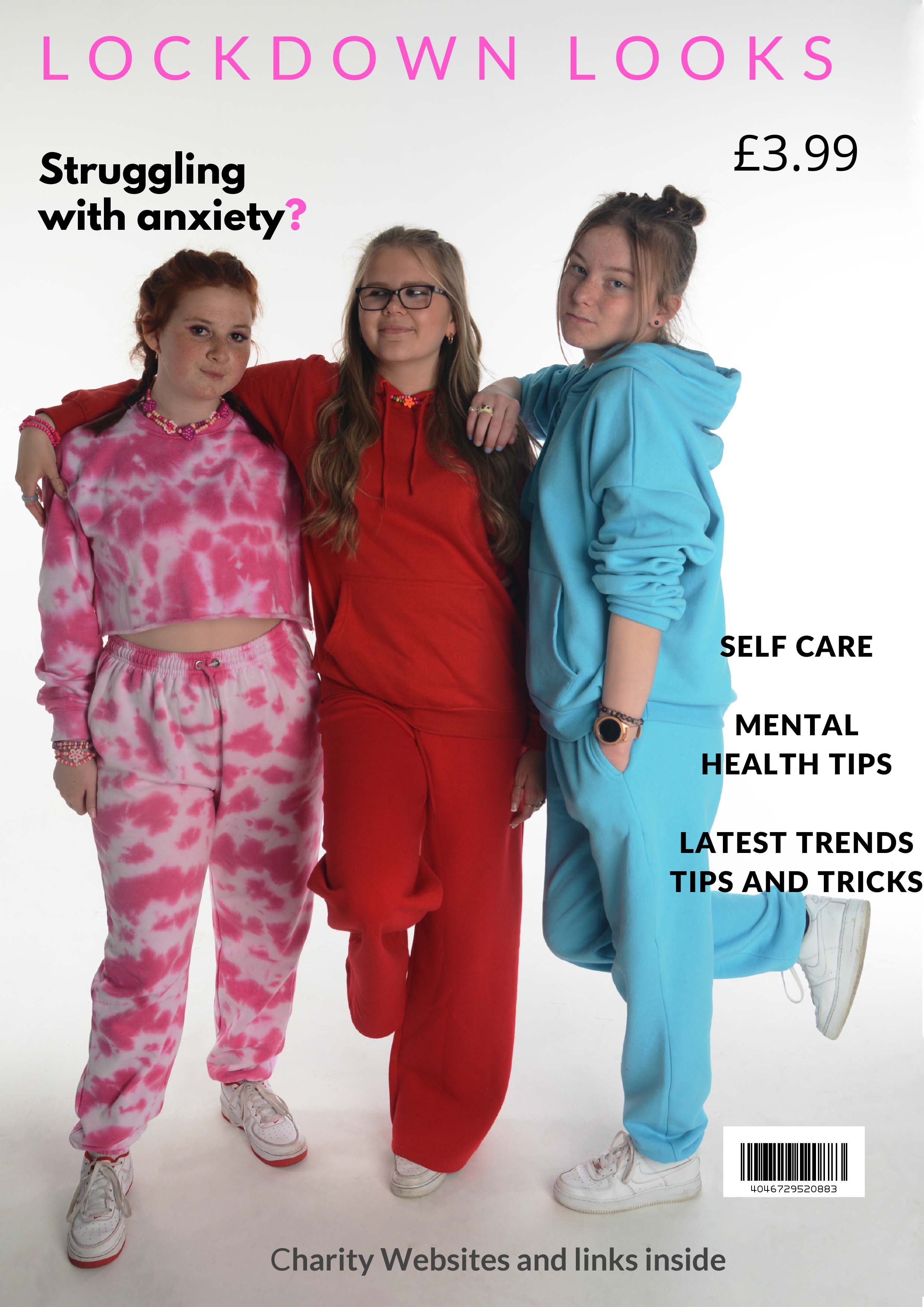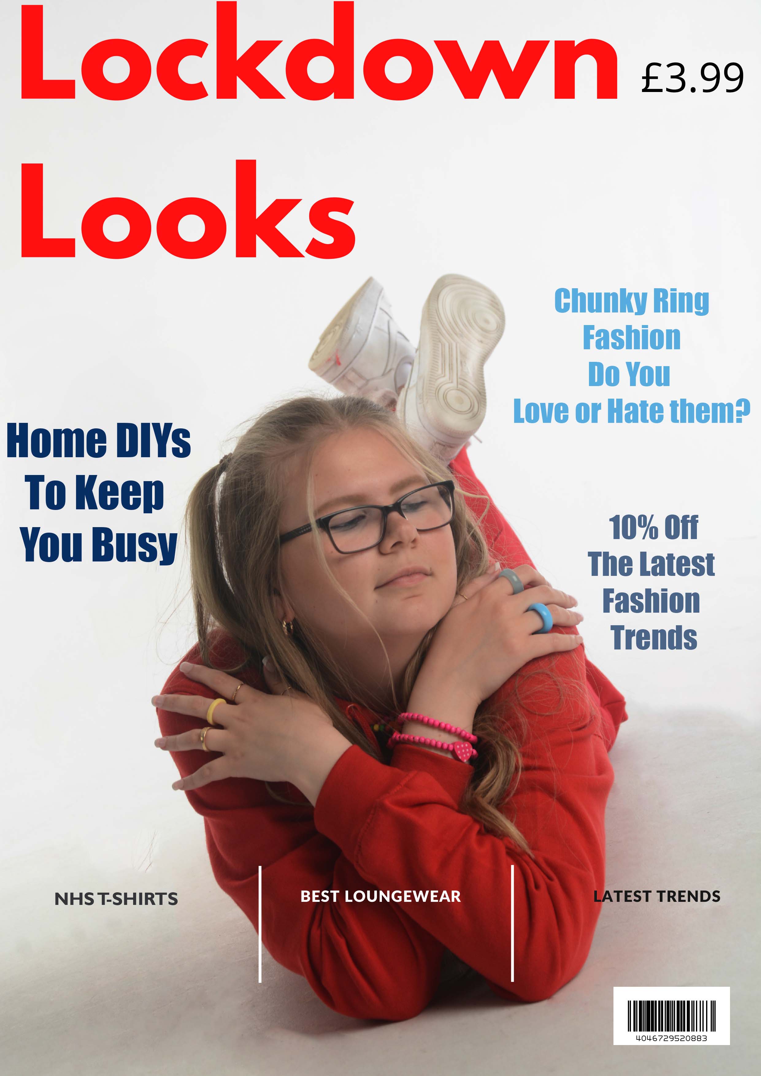"I created a series of magazine cover ideas using the sub-theme 'Lockdown Looks' based on Art and Identity. I researched a series of fashion stories and ideas from Vogue, ID and Elle magazine. I created a colour palette for my fashion story and ordered a range of casual and trendy fashion outfits based on street wear for myself and my models. I organised a fashion shoot in the photo studio. I then used Adobe Photoshop and Canva to edit my photographs create a series of fashion magazine covers with titles and text for my final outcomes.