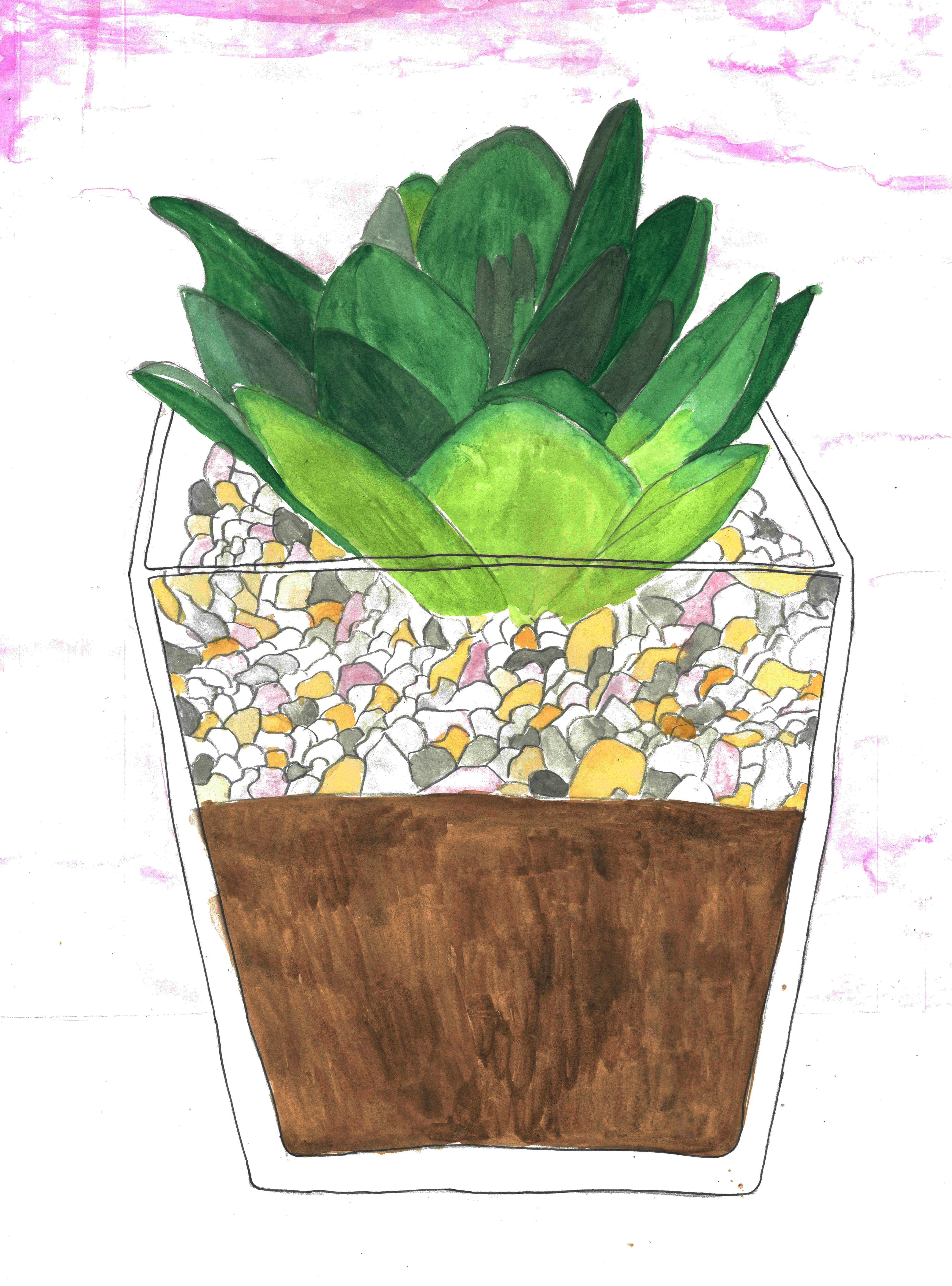 "My final piece was inspired by the potted plants in the spaces in my bedroom. As a starting point I photographed my bedroom from different angles and made drawings from my primary photographs. One of the artists that has inspired me is Lara Meitnjes who paints flowers with acylics on paper, combining realism and fantasy. I developed a series of drawings and paintings of plants from my bedroom. I have used details and patterns to make my drawing imagery interesting."