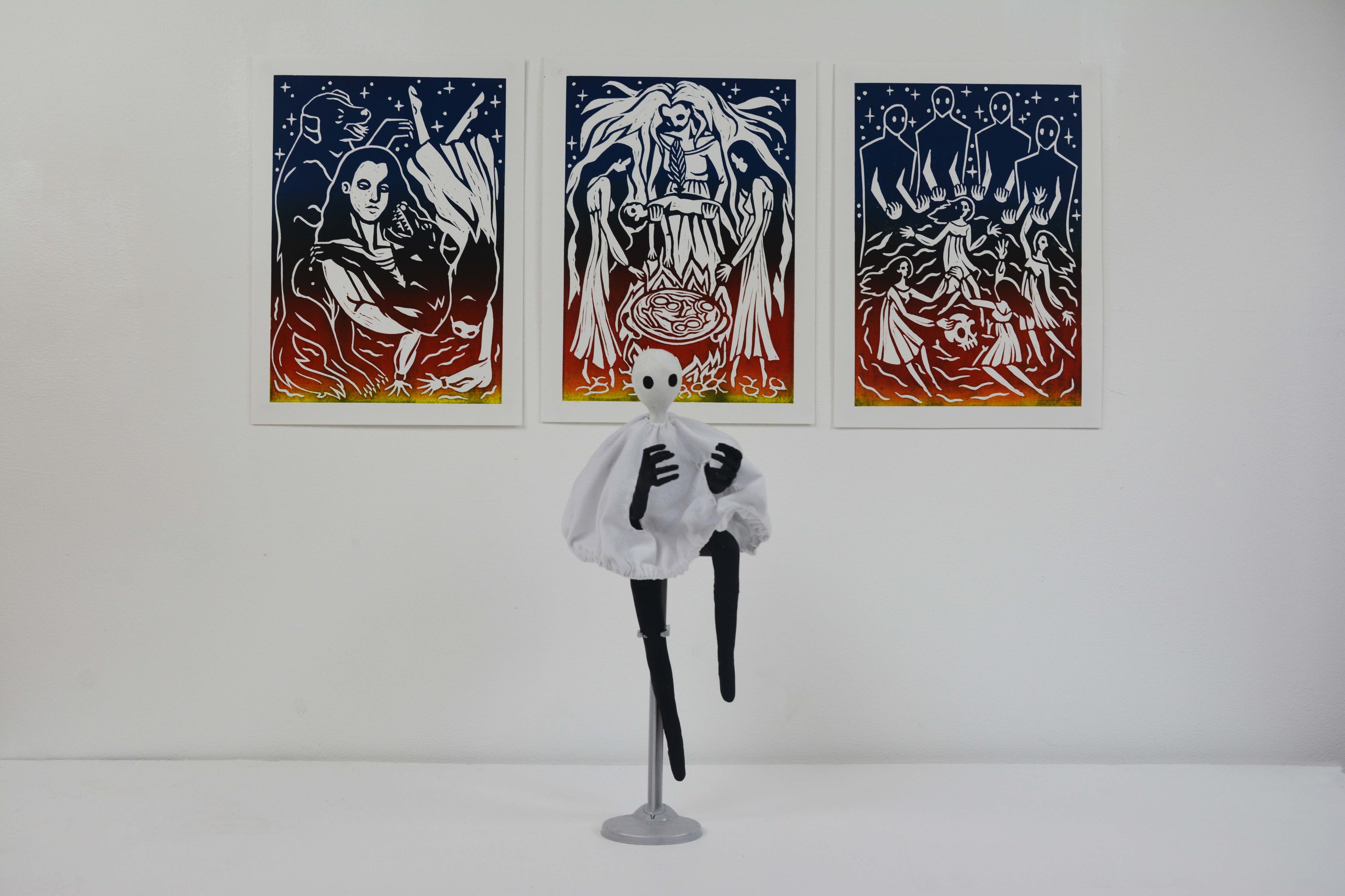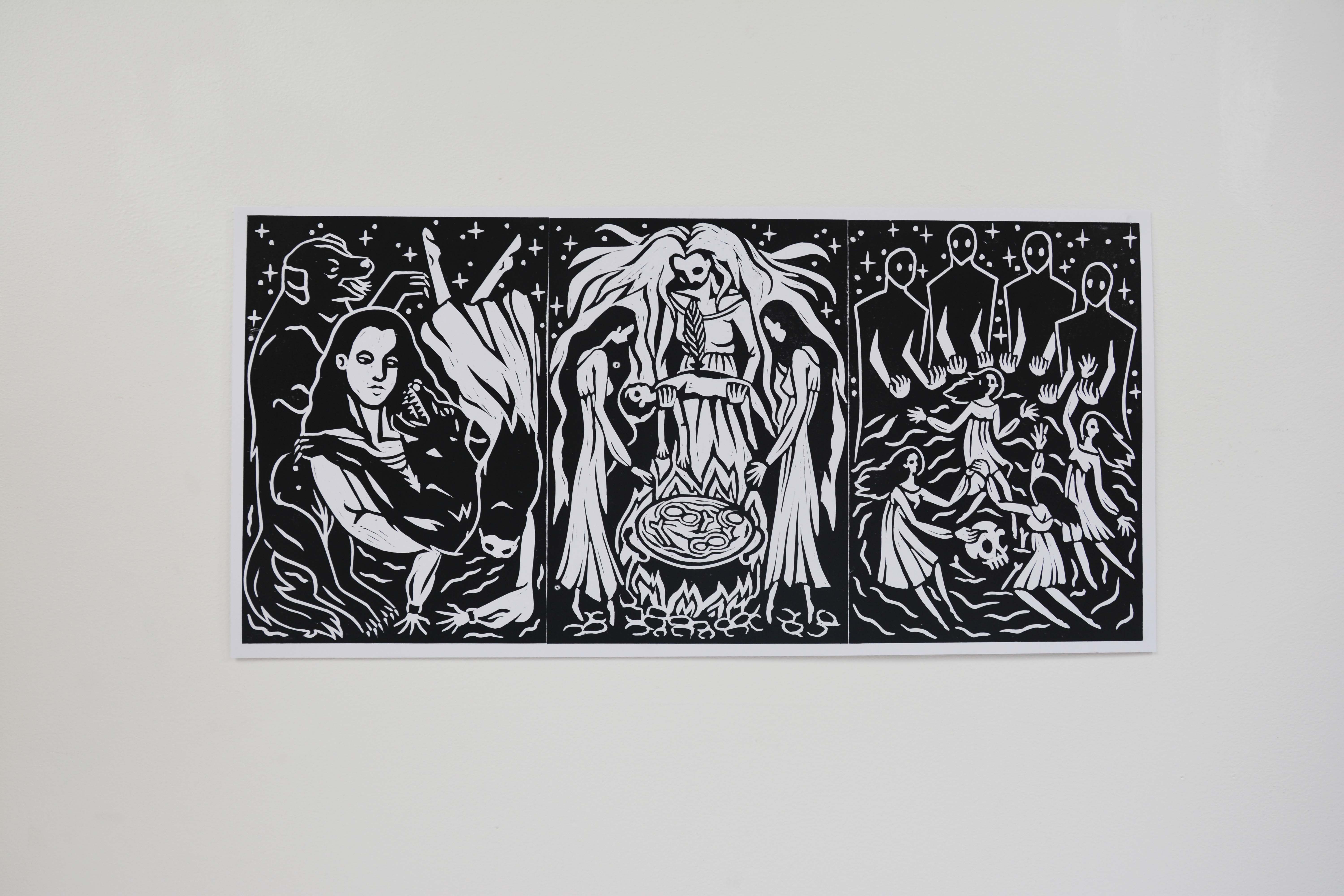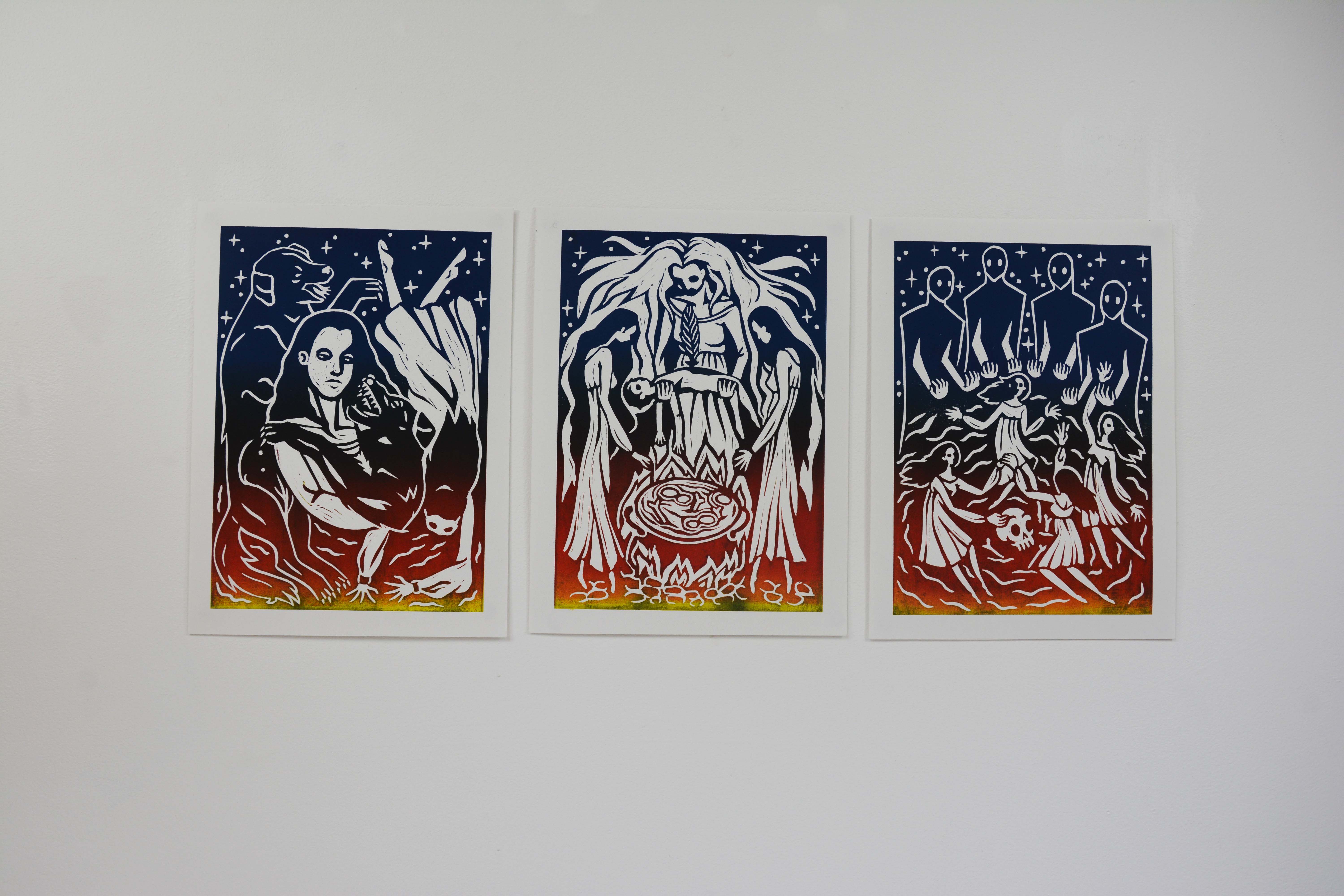 For the lino prints I have shown the three different crimes that the witches where accused of at the time.