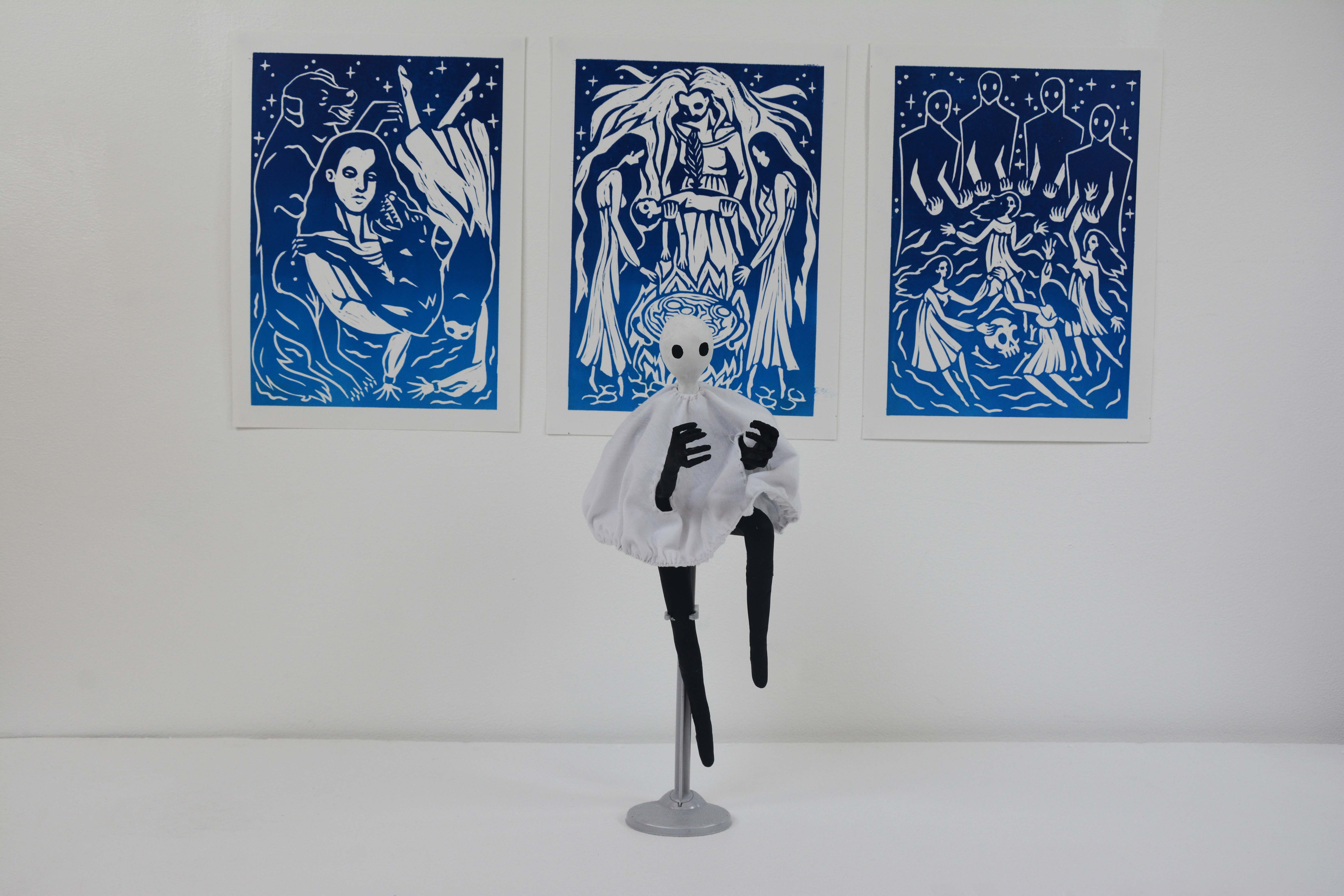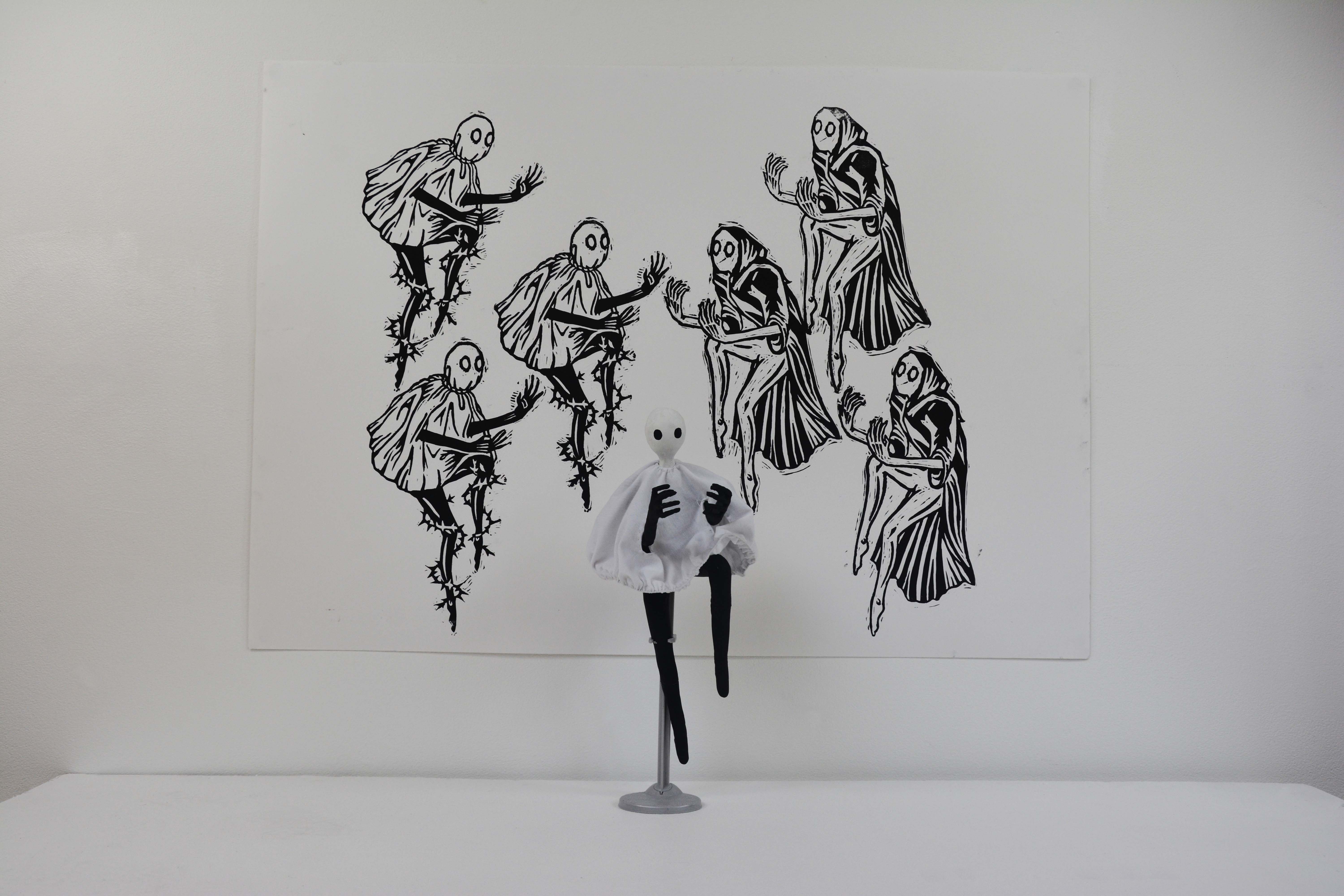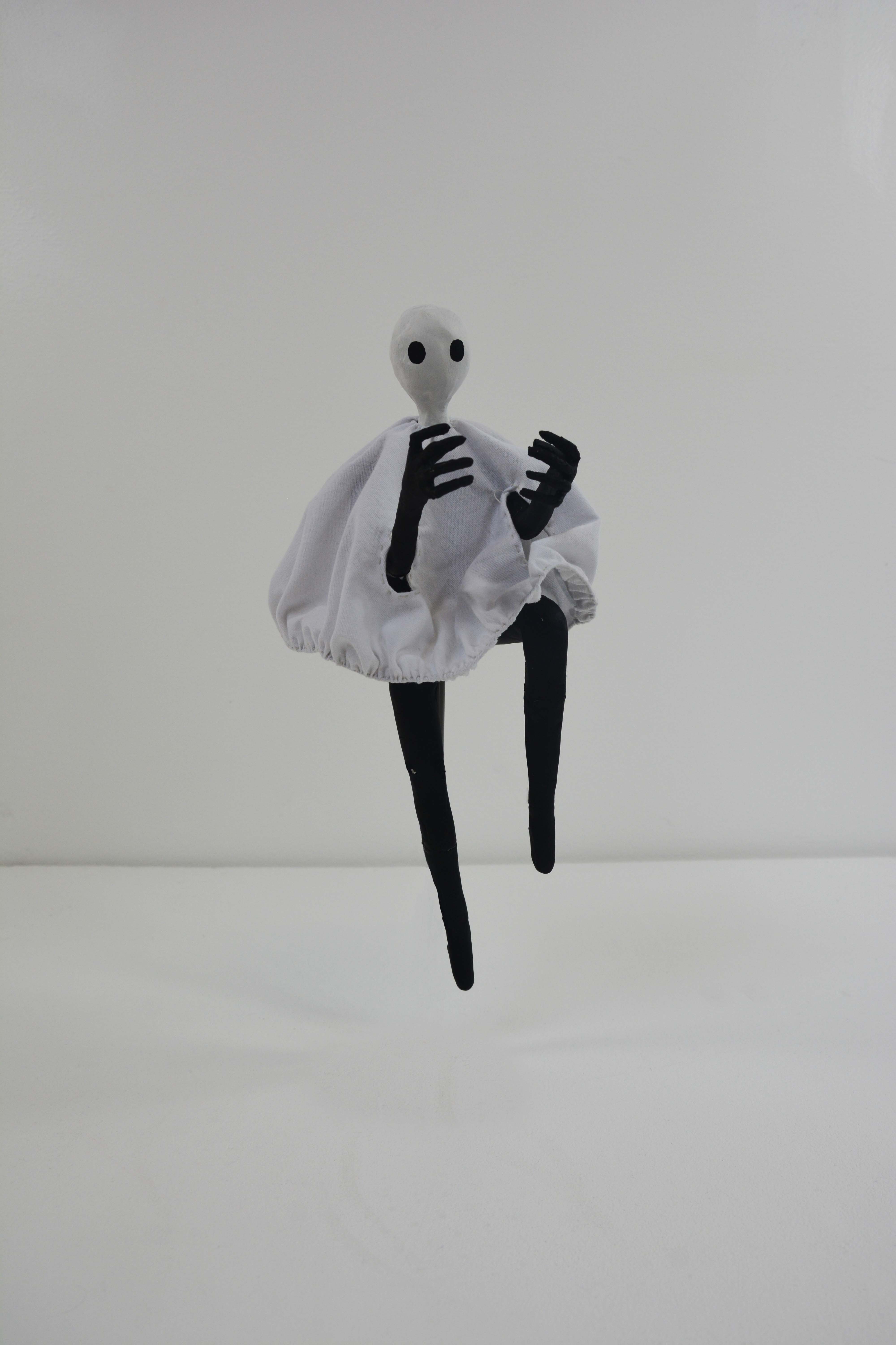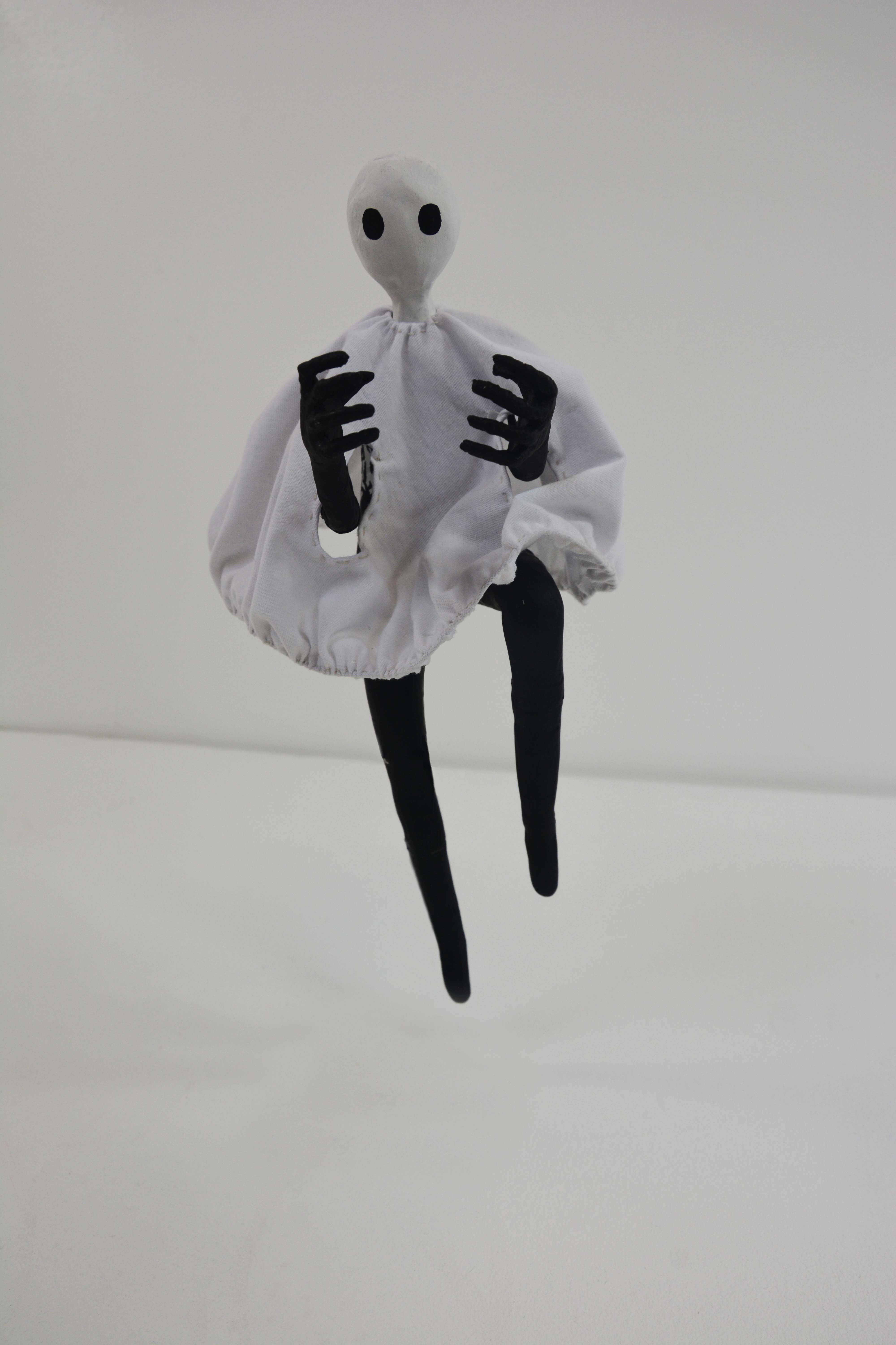 The model is made from a body of wire and air dry clay, then painted with acrylics and wearing a fabric ‘white sheet’ with a wire hem for poses, an elastic collar and arm holes.