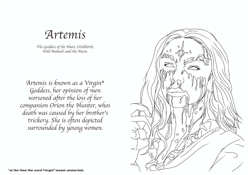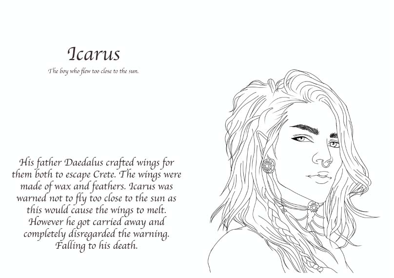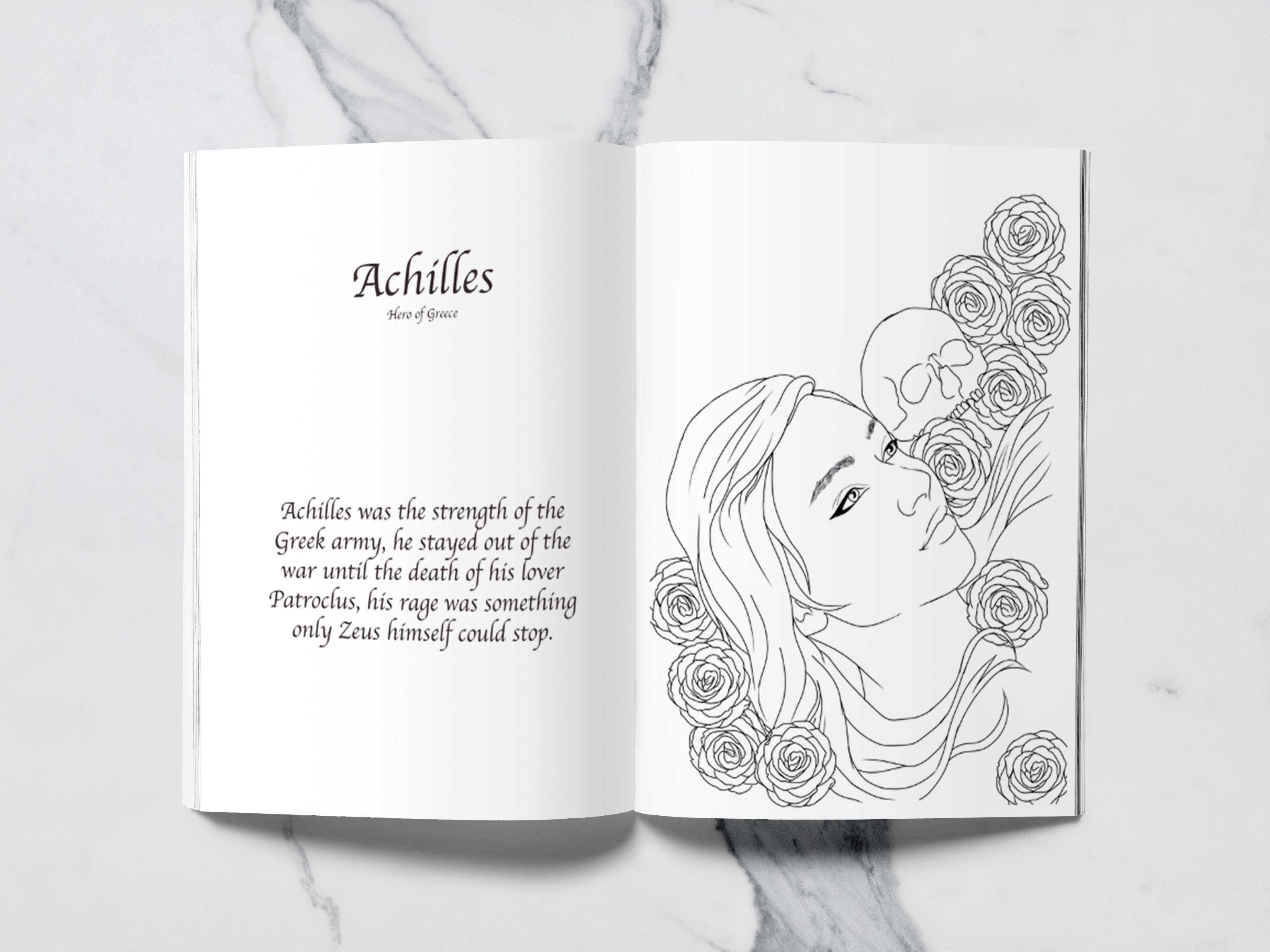 "For this project I produced a Mythology themed colouring book for adults with illustrations and facts around with the theme of Greek Mythology as I am passionate about this theme. I researched different aspects of Greek mythology referencing Homer’s Iliad and Odyssey as well as the Greek alphabet, this allowed me to show the original Names of different gods and figures. I looked at more unknown information, covering misconceptions about different mythological figures.
