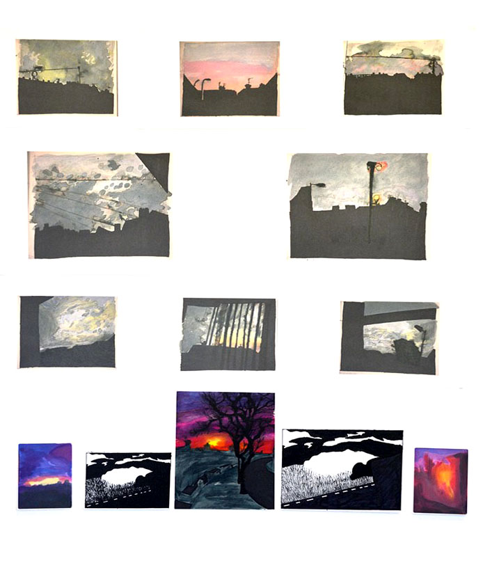 This project has the theme of data, keeping this in mind I will focus on data surrounding the sky. I have looked at how the sky changes with time, and the different types of clouds. I gathered my own data by taking photographs of the sky daily at different times of the day. My photographs recorded and documented the sky’s changes; I then used my photographs as my primary data creating work from them. I experimented with various types of media to create visuals for the data I gathered.
