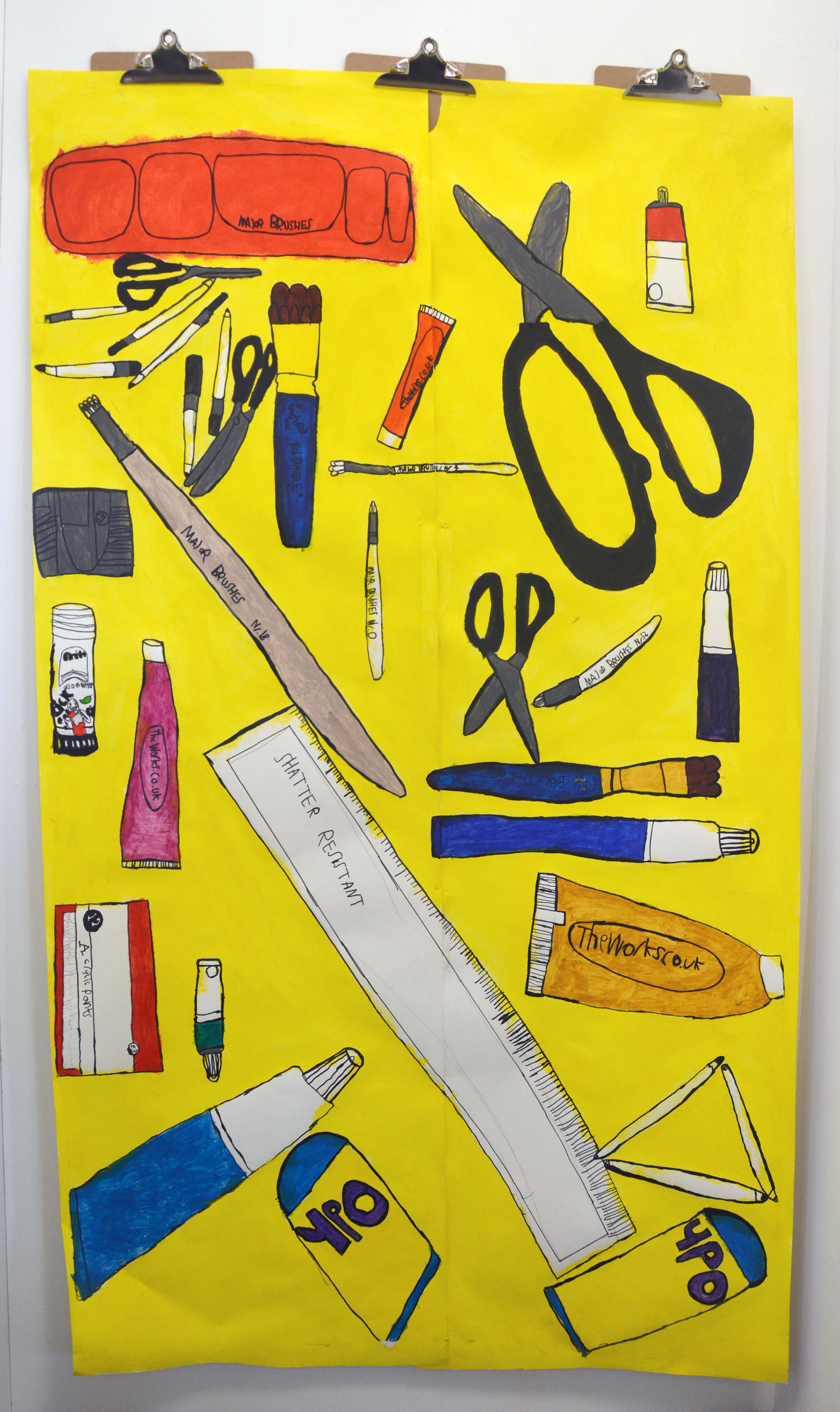 Using large rolls of paper I began to outline and sketch my everyday objects on a large scale, I decided to draw the items that I used the most during my Art & Design lessons such as pencils, rubbers, sharpeners, glue and paintbrushes. Once the outline was complete I added the bright, eye-catching yellow as a background and proceeded to use my acrylic paints to add detail and colour to the individual everyday objects."