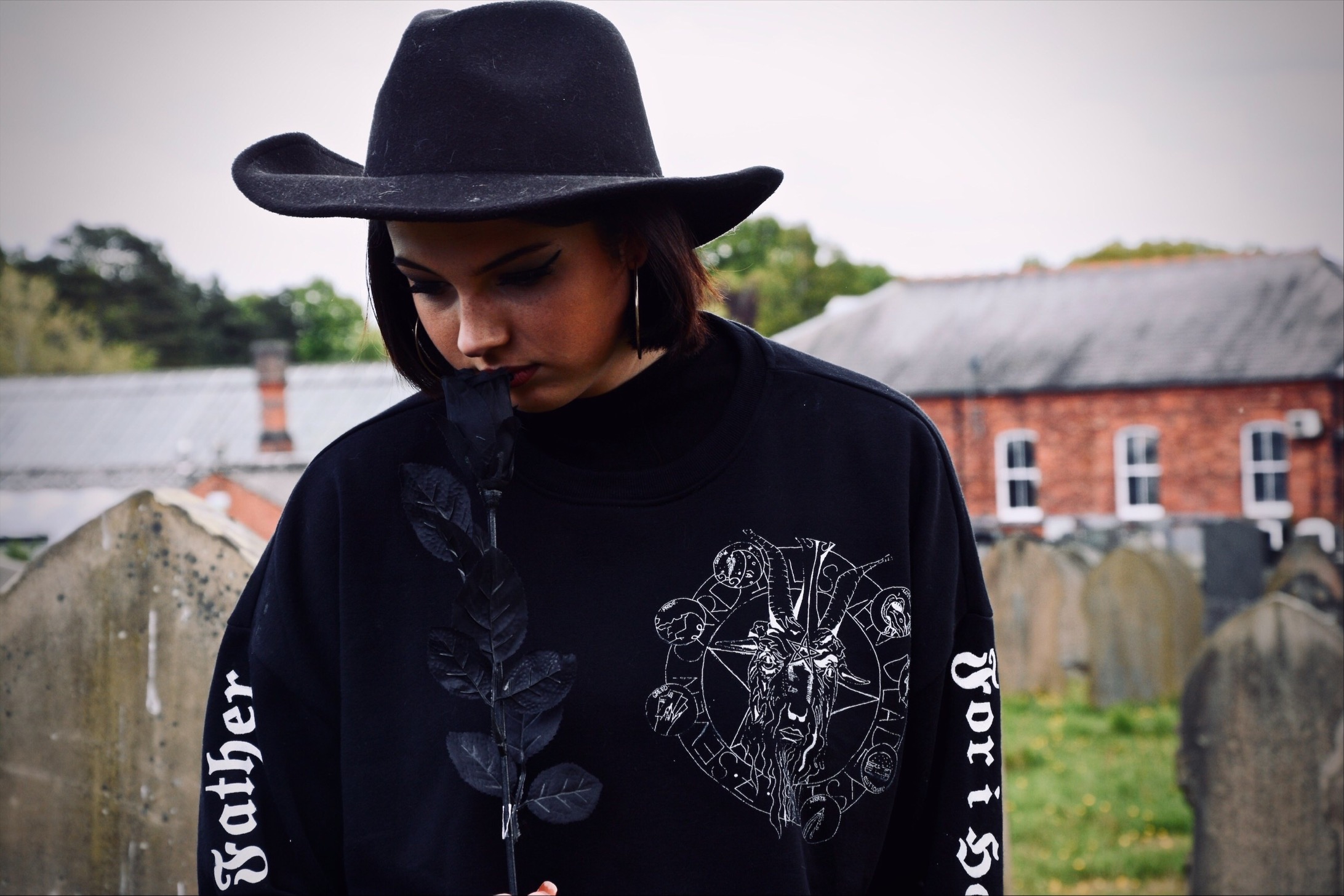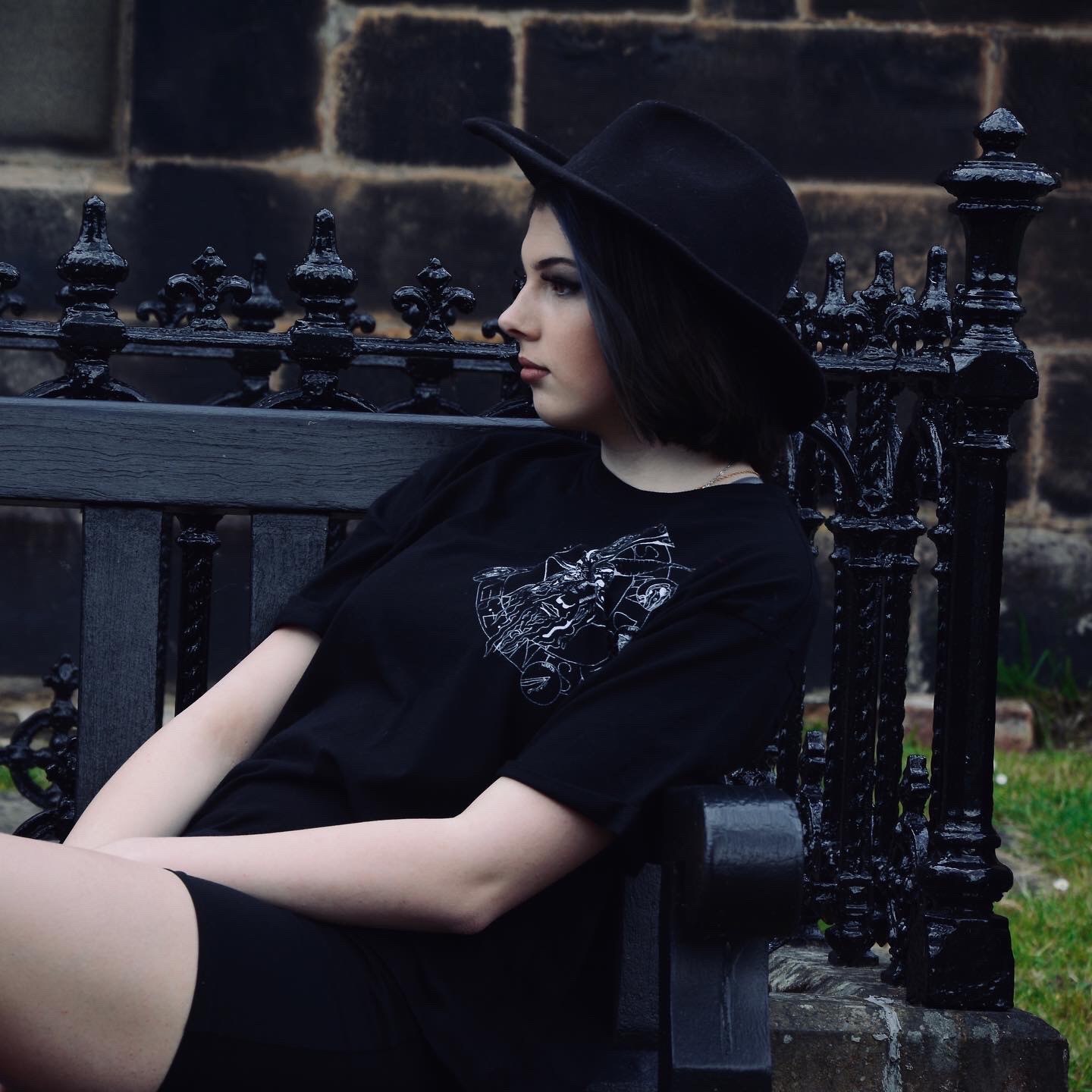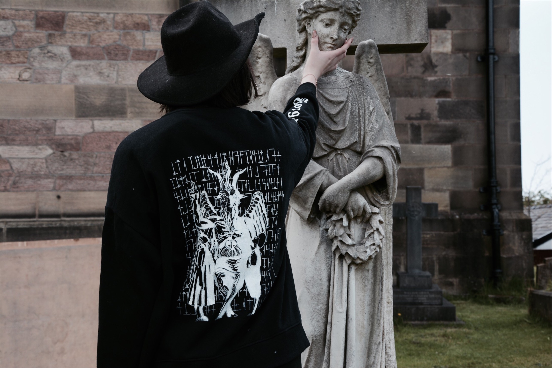 I wanted to incorporate screen printing so decided a clothing line would be a good way to showcase my ideas. I used motifs such as a statue of Baphomet for one design, and as goat for another because of its close affiliation with Satan. I then incorporated religious sayings in my design such as “forgive me father for I have sinned” when confessing sins in church. To ensure my final photographs were atmospheric and in keeping with my theme we shot in a local grave yard."