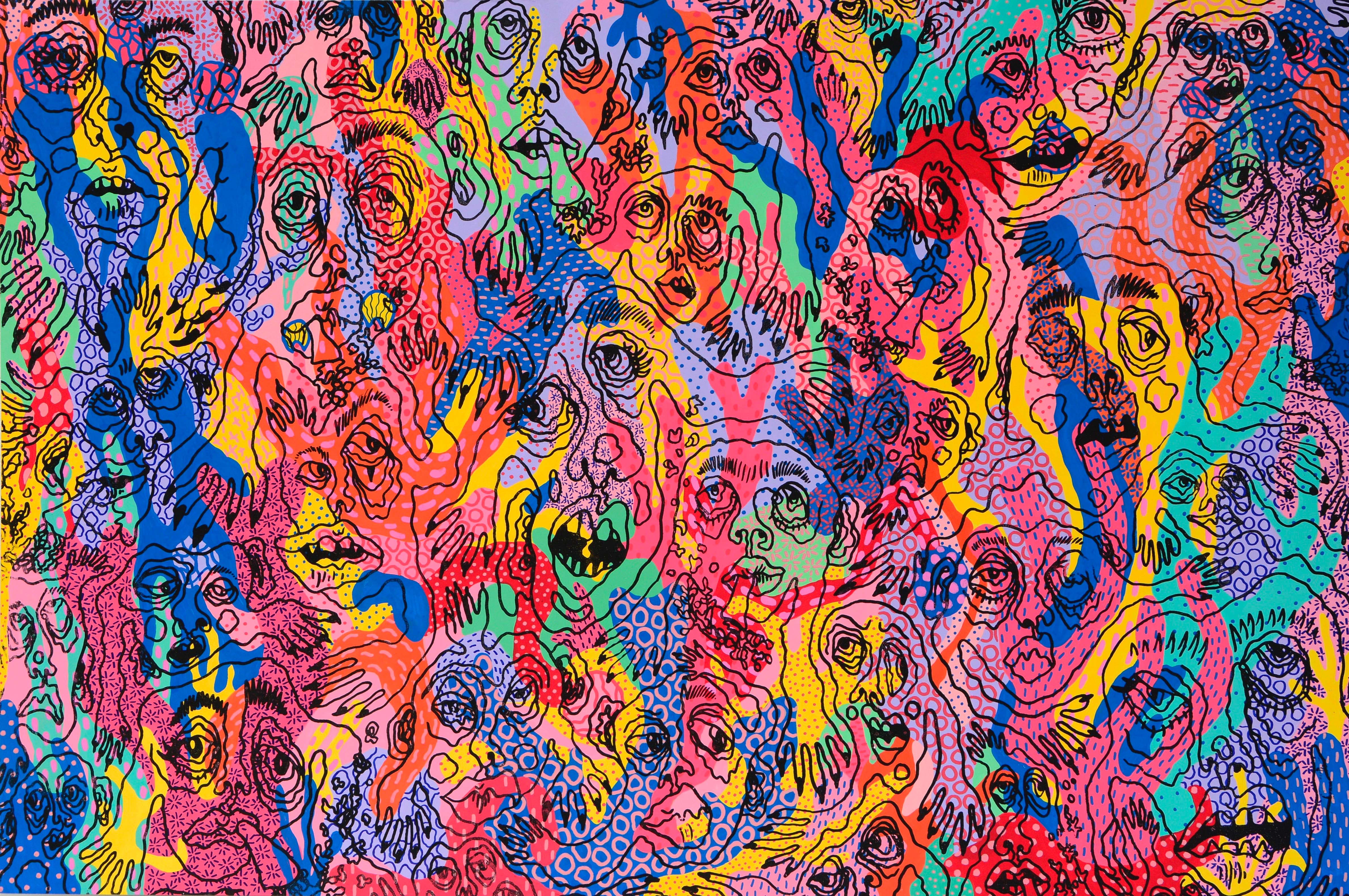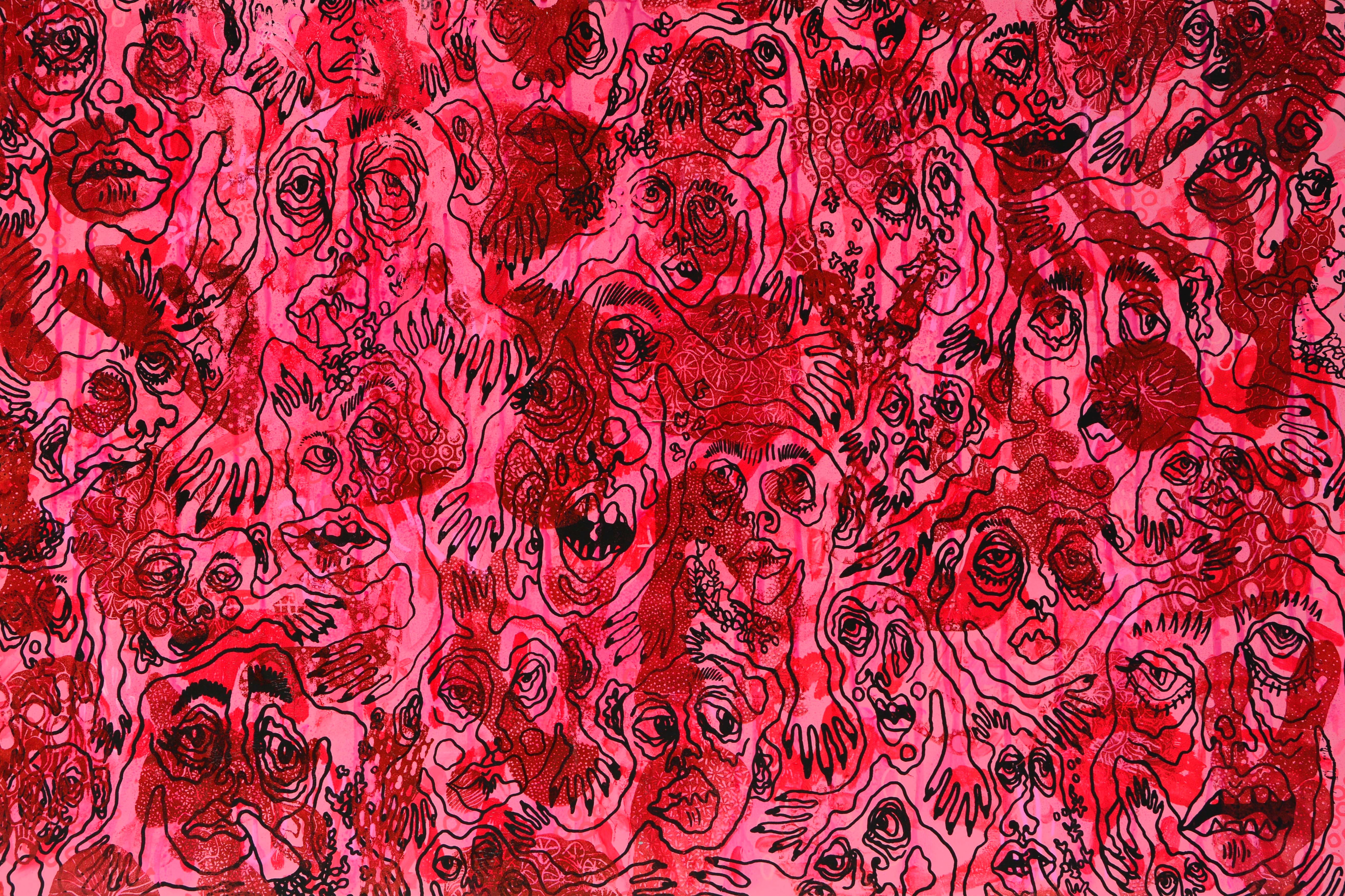 "My first piece is an A1 acrylic painting on cardboard, inspired by the ethereal and organic shapes of coral that marine species rely on to survive, simplifying them into more abstract forms with patterns added in coloured pen. The vivid colours of thriving coral juxtapose the screen-printed black illustrations of grotesque humanlike creatures on top, to highlight the threat of human endorsed climate change.