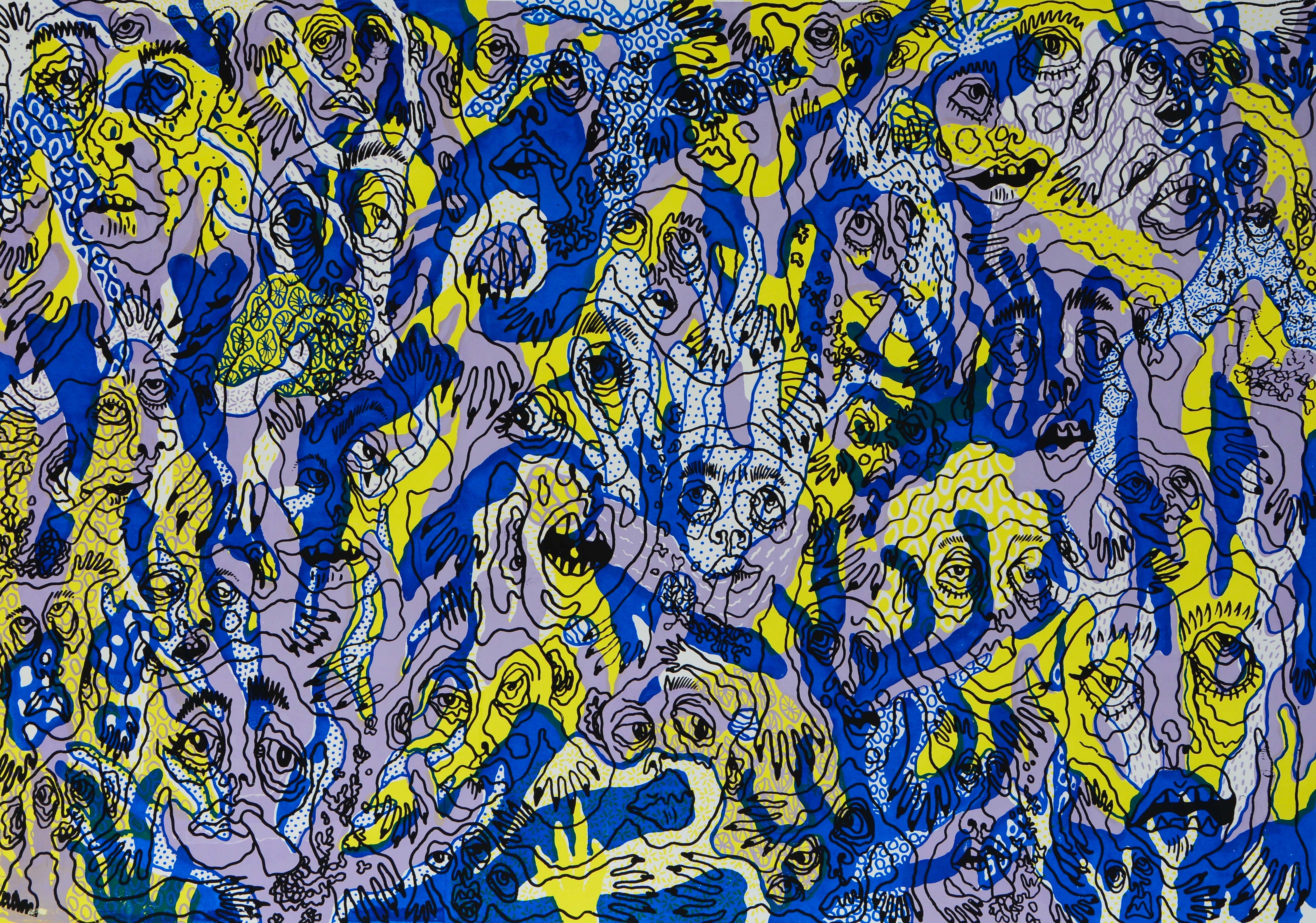 The second piece is a four-layer A1 screen-print in fluorescent yellow, purple and blue with hints of white emulating bleached coral. Rising ocean temperatures damage corals' ability to make food, resulting in colour loss. Some bleached corals can produce a chemical to protect themselves from climate change, making them glow in these colours. Despite the joyful appearance, the coral is going through a phase of death, and this is a cry for help.