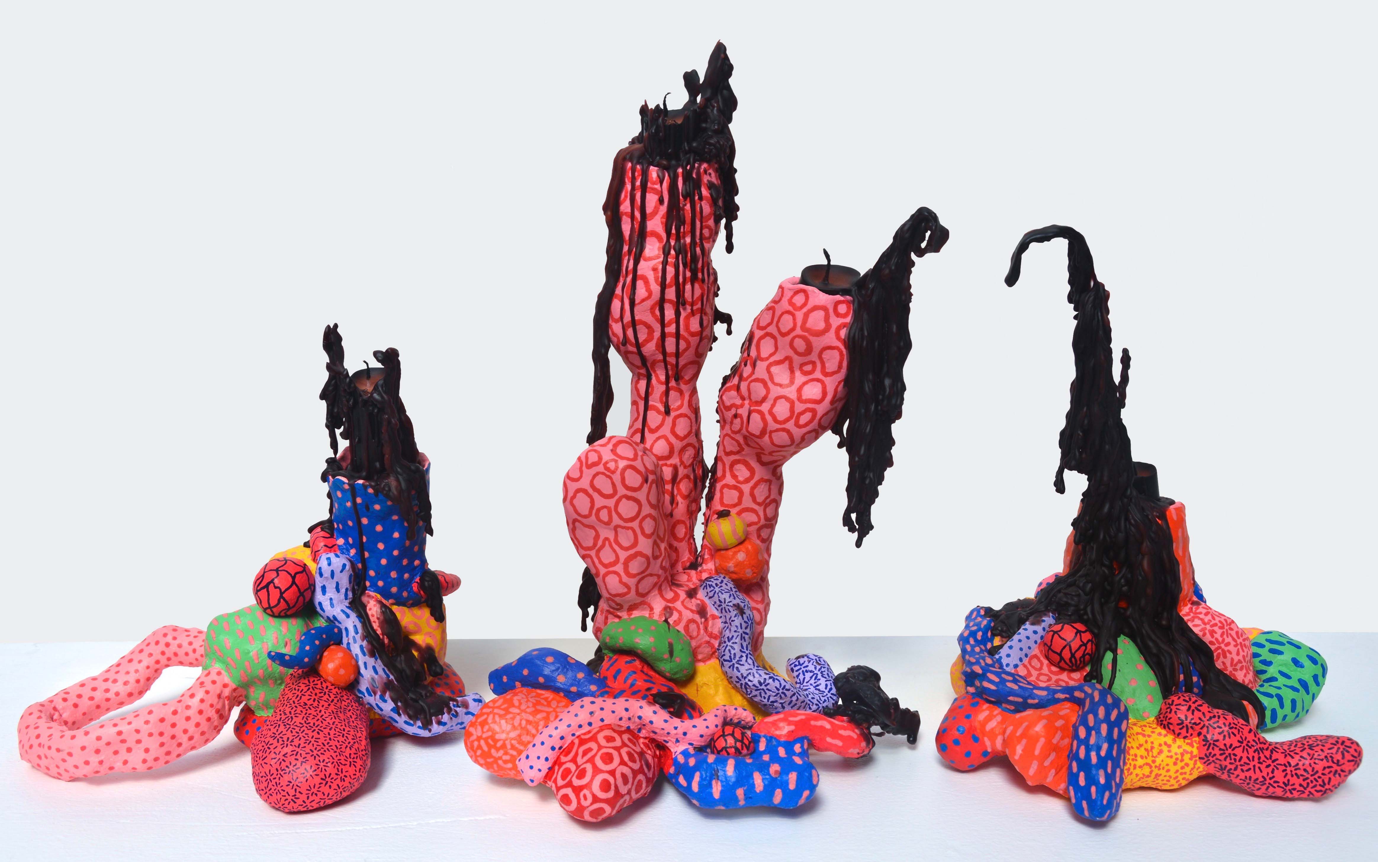 Finally, I made candle holders from clay, newspaper, tinfoil, rocks and Modroc, then painted them with added pen details. I filmed candles melting over the sculptures and combined the footage into a short film documenting deteriorating coral. Humankind is the flame, exploiting the Earth by burning fossil fuels and pushing the ecosystems we rely on for survival into oblivion, resulting in irreparable critical damage."