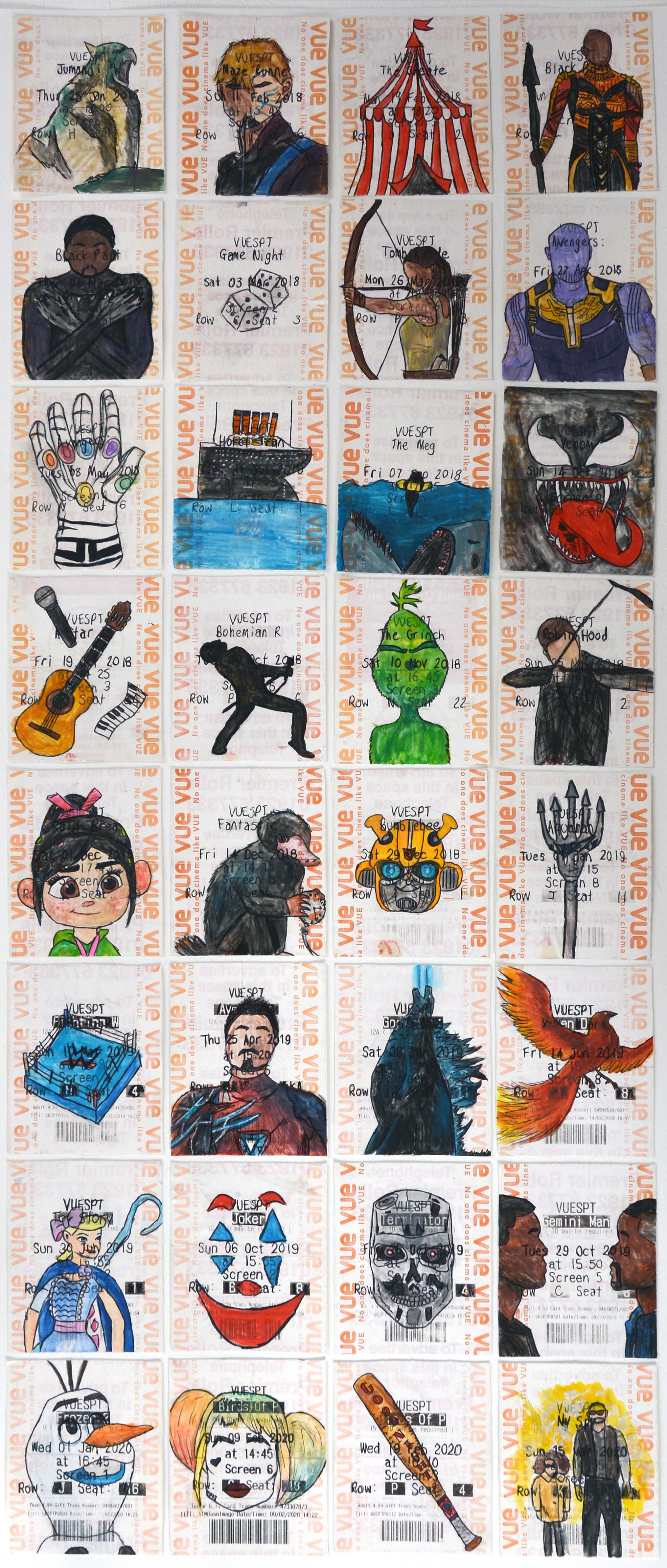 "My final piece was inspired by films and how much I love to go watch and experience new films in the cinema. For my final piece I used a combination of tickets that I have collected since the start of 2018 to form a base for my paintings. The characters and vibrant colours from some of the movies inspired colour palette for my mini paintings. I used watercolour markers as well as a watercolour palette. I sketched out thumbnails for each of my unique paintings in my sketchbook before drawing and painting the final outcomes on each ticket.