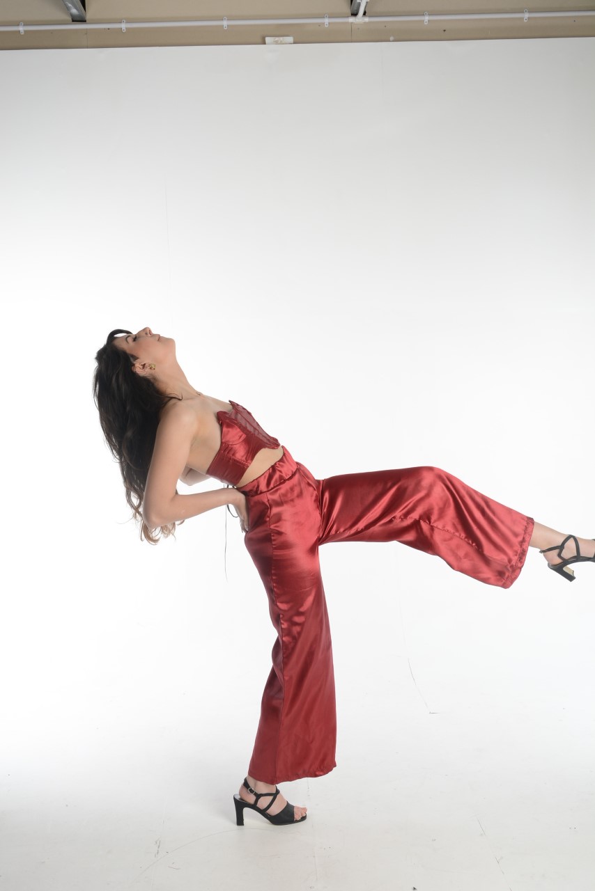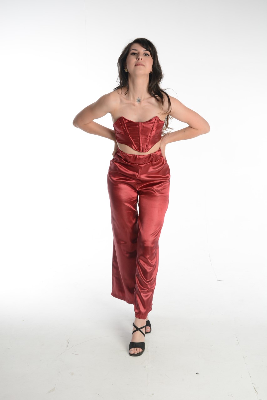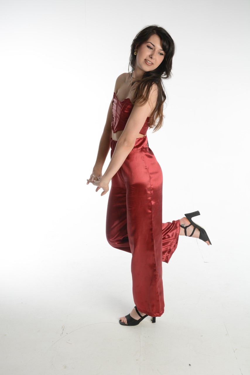 "For my final piece, I made a 1990s runway inspired outfit that consisted of a strapless corset style top and wide leg trousers. The corset top was inspired by 90s Vivienne Westwood and the trousers where inspired by 90s Comme De Garcons.