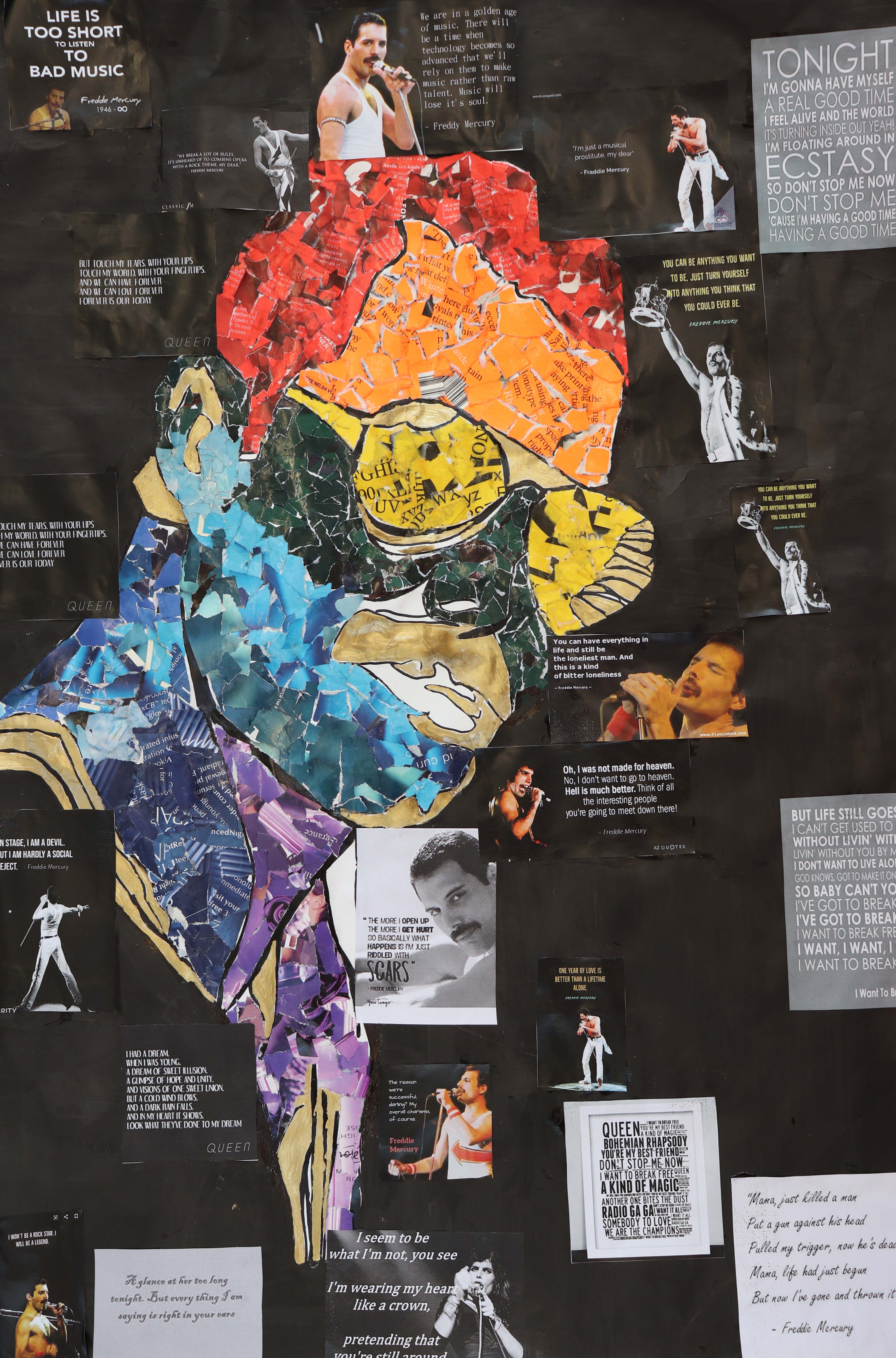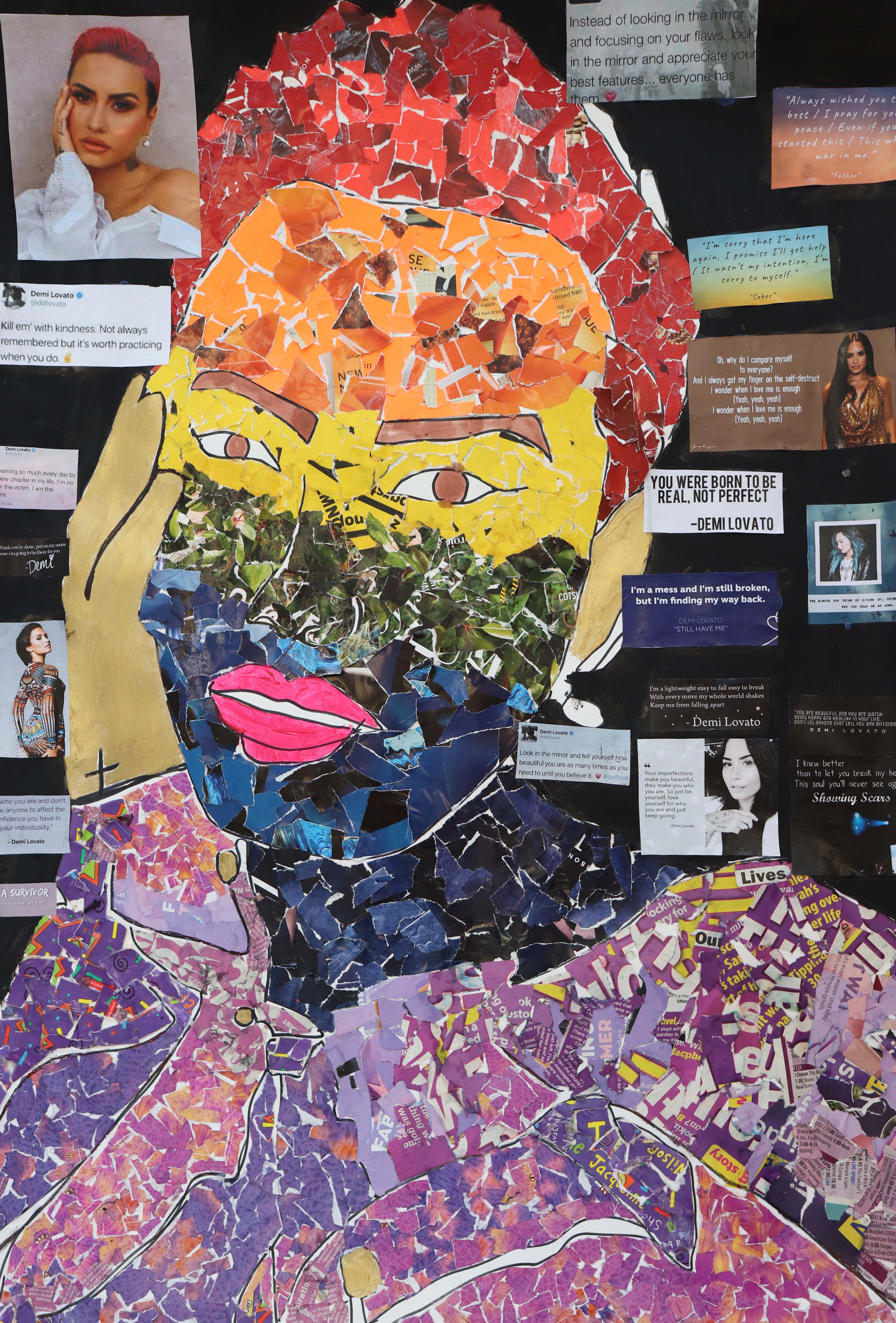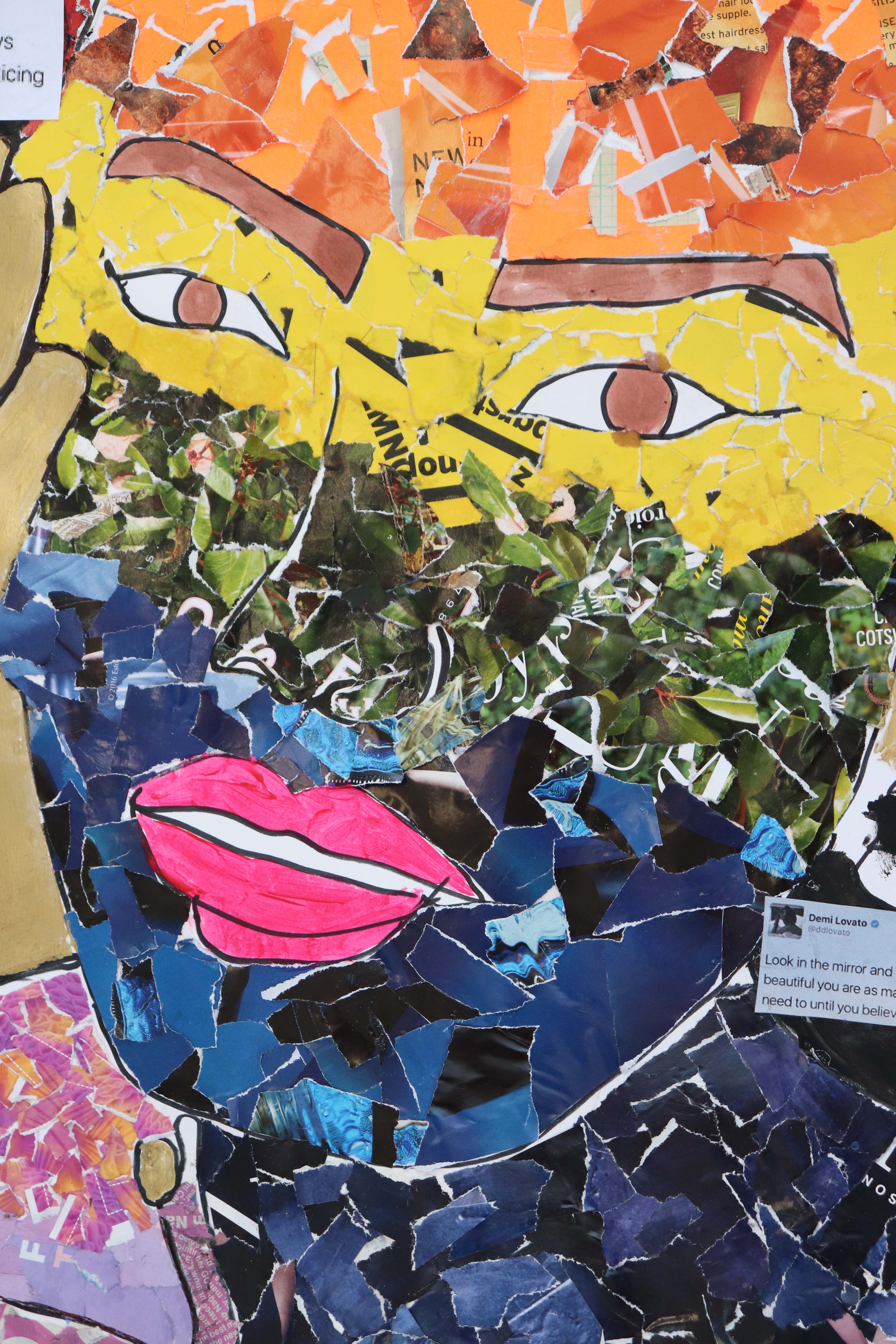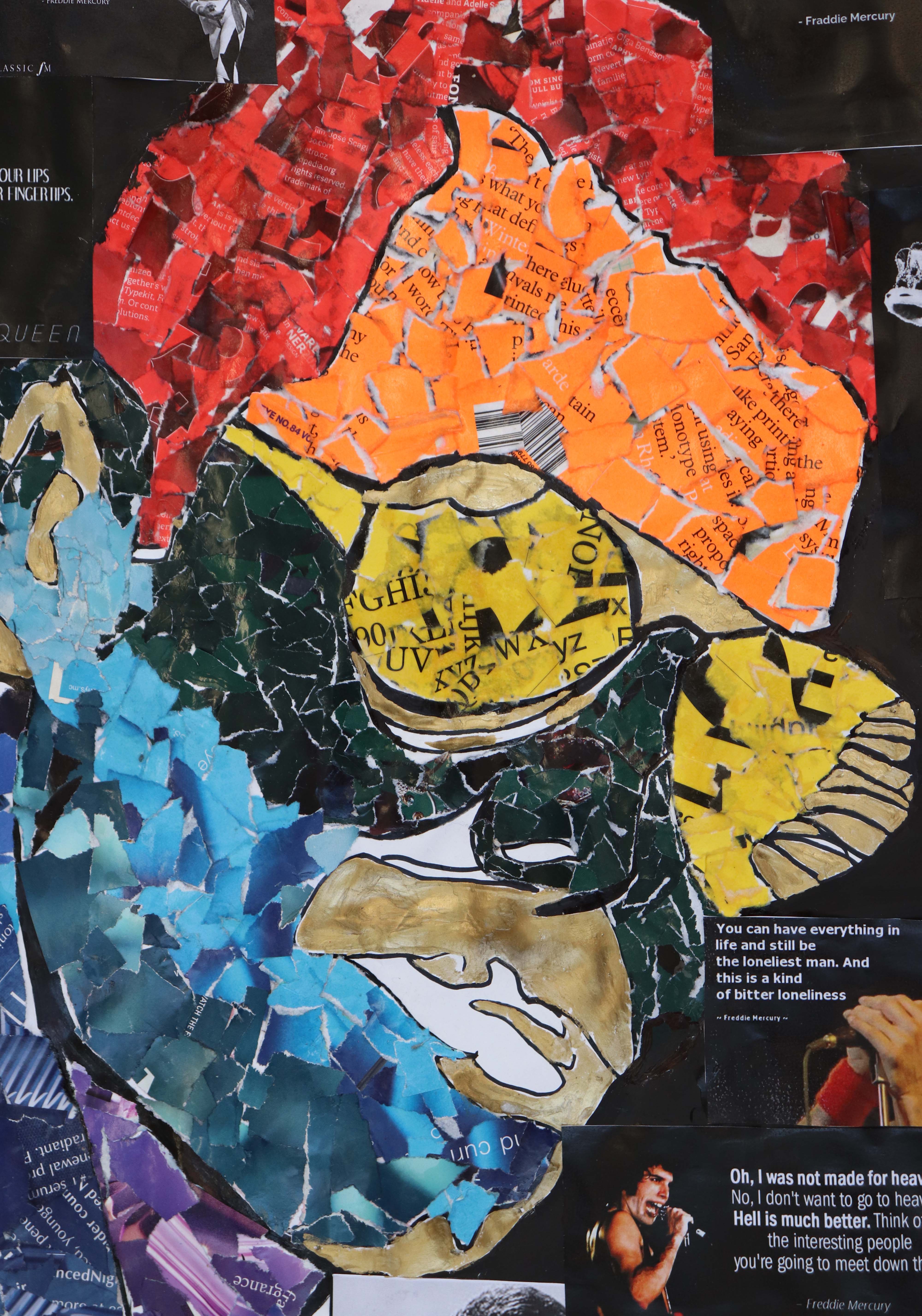 For this project I have taken a lot of inspiration from my favourite artist Andy Warhol and the art movement known as pop art. After experimenting and developing my idea of creating portraits of famous individuals from the LGBTQ+ community that everyone would recognise I settled on working large scale in a collage media. I have collaged two portraits working at a2 size, one of Freddie Mercury and the other of Demi Lovato in the LGBTQ+ rainbow colours using magazines, newspapers and coloured papers. I have then added fitting quotes made by the two celebrities that promote positivity, inclusion, diversity and support for the LGBTQ+ community."