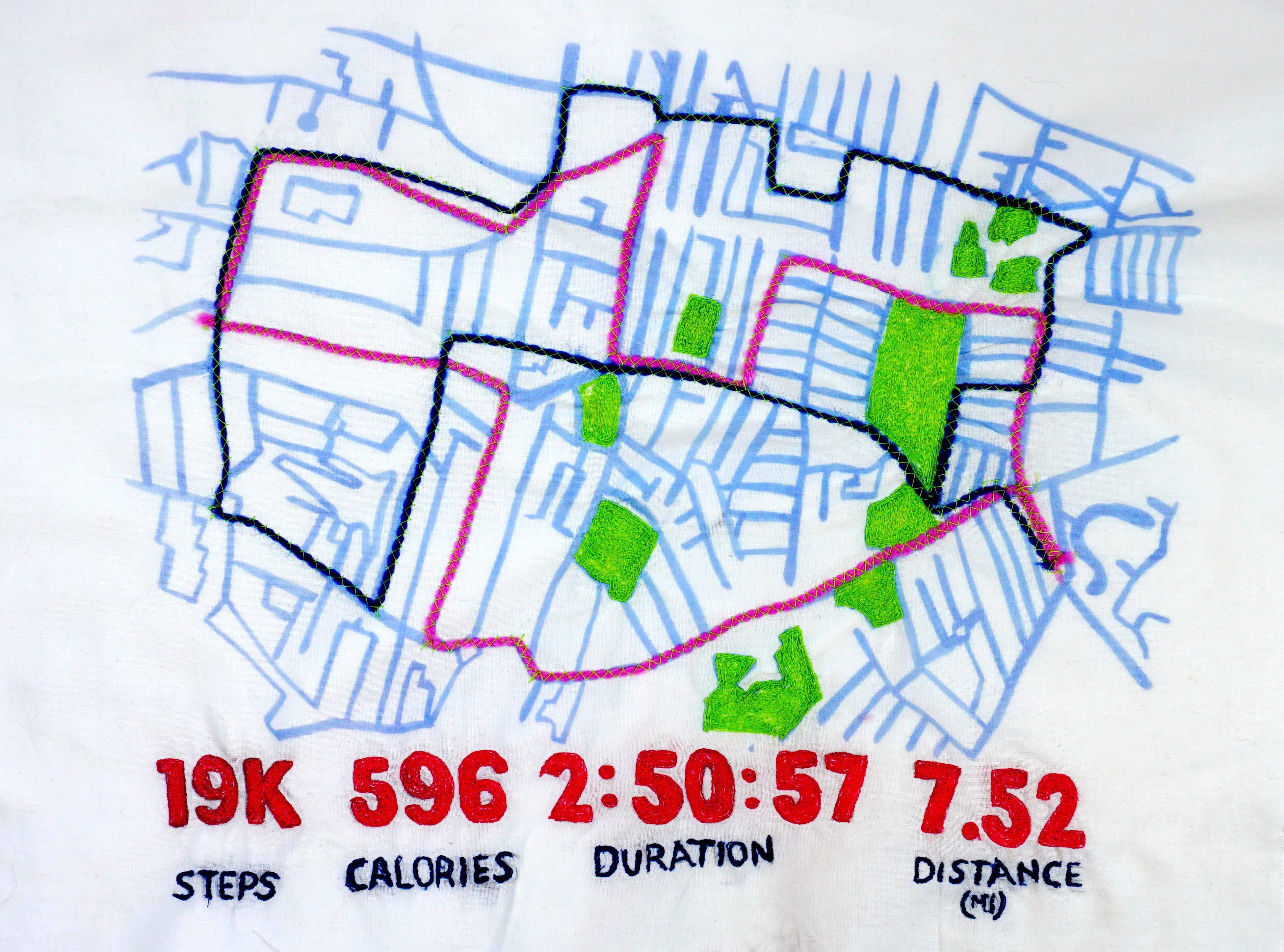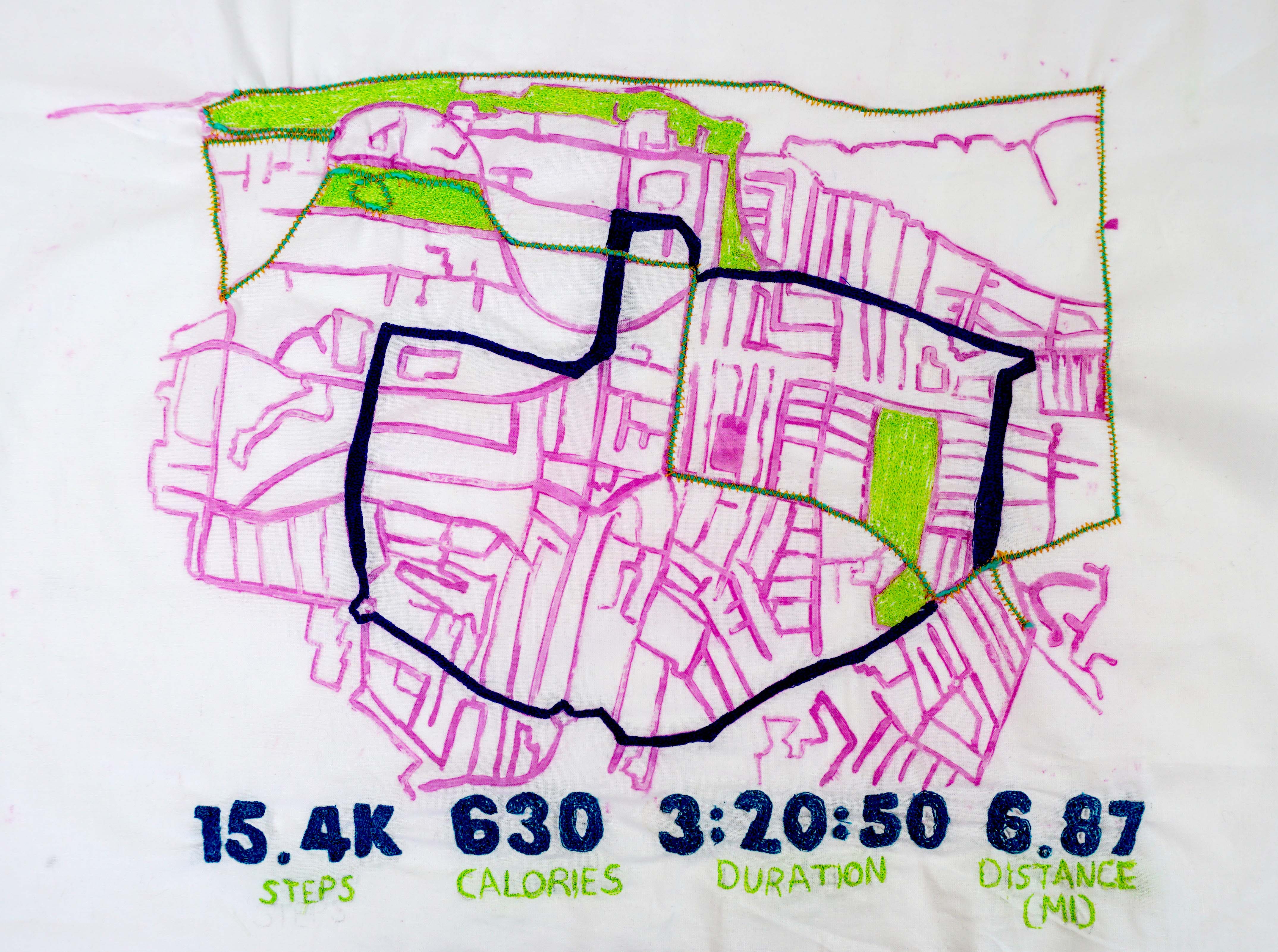 My work is based on collecting data from my daily routine. I was inspired by my daily keep fit routine of running and walking and decided to keep a record of my distances, steps and other relevant data for my project. I collected maps of the area around my house and mapped my running and walking route on the map. I began to draw from my maps and routes, printed my images on to fabric using the transfer heat press and screen printing. I then machine embroidered my pieces highlighting my routes in different colours and as well as hand embroidering the statistics and data.