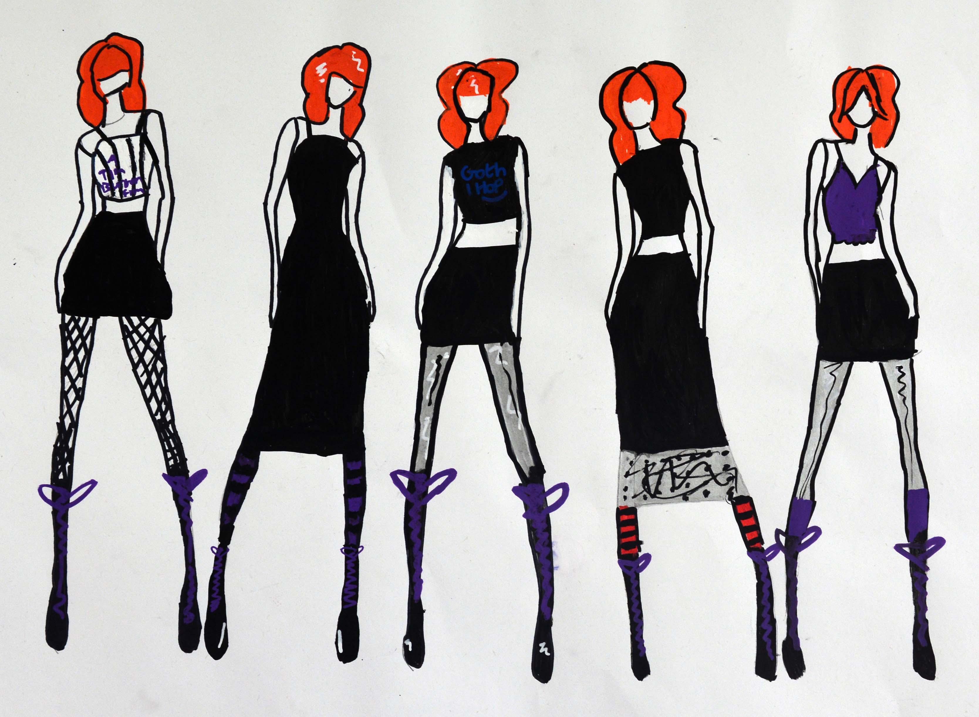 "My project is based on Identity with a fashion sub theme. I have explored a collection of fashion illustration pieces linked to my identity and personal fashion tastes. I have explored drawing with pencil, fine liner and inks on paper. I was inspired by the designs of the fashion designer Vivienne Westwood and her historic Punk style from the late 1970s, as well as the iconic singer Siouxsie Sioux from the band Siouxsie Sioux and the Banshees."