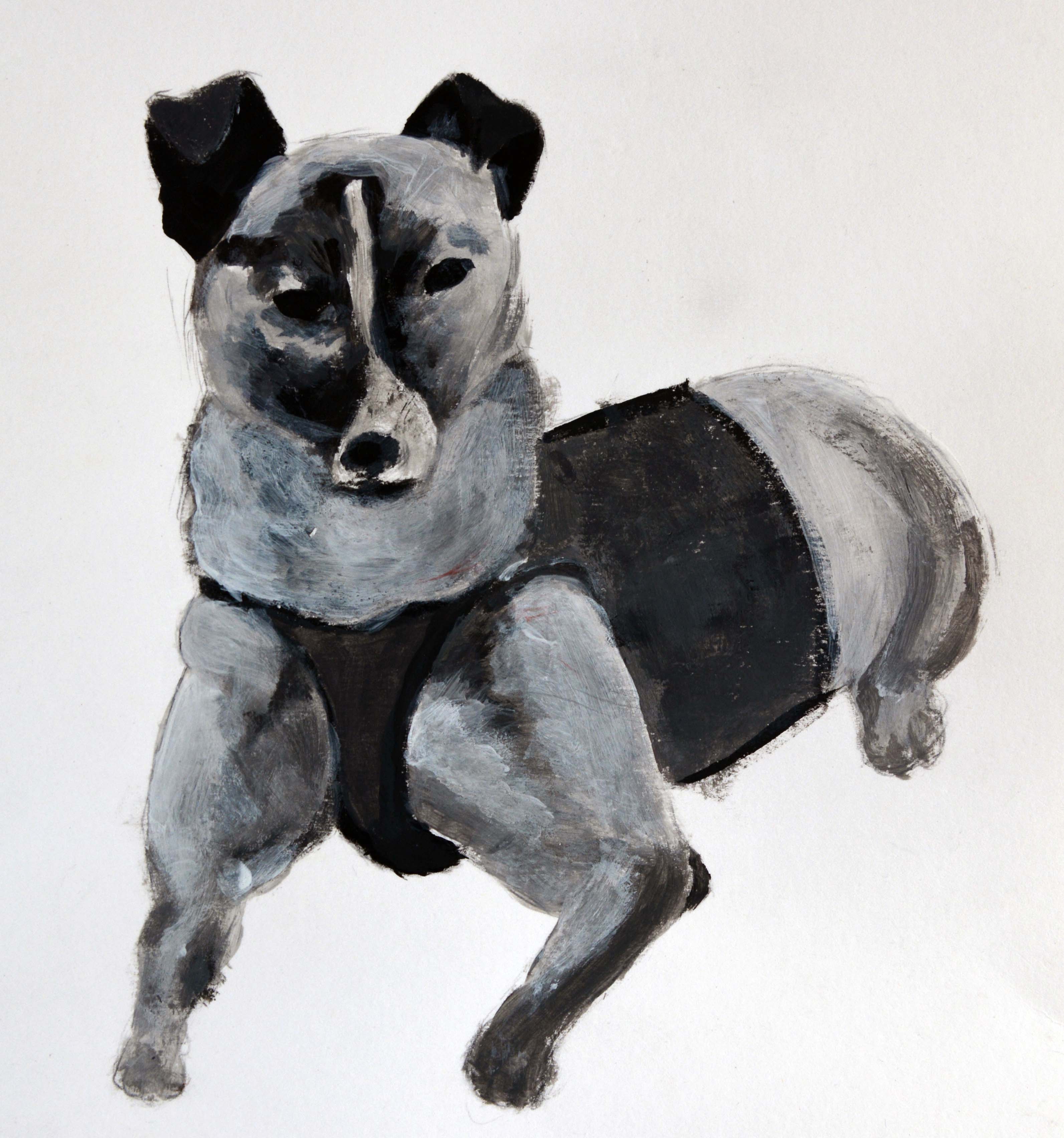 The theme of my work is based on the Data theme researching the number of animals, including dogs, cats and monkeys that were sent into space as part of the American and Russian space programme. This is an emotive topic, but also a very interesting and shocking slice of history. I have made my drawings and paintings from referencing a series of my own photographs taken in the studio of my own dog to replicate some of the dogs that were sent up to space. In my two final pieces I painted the animals using a mixed media of oil paints, acrylic and colour pastels.