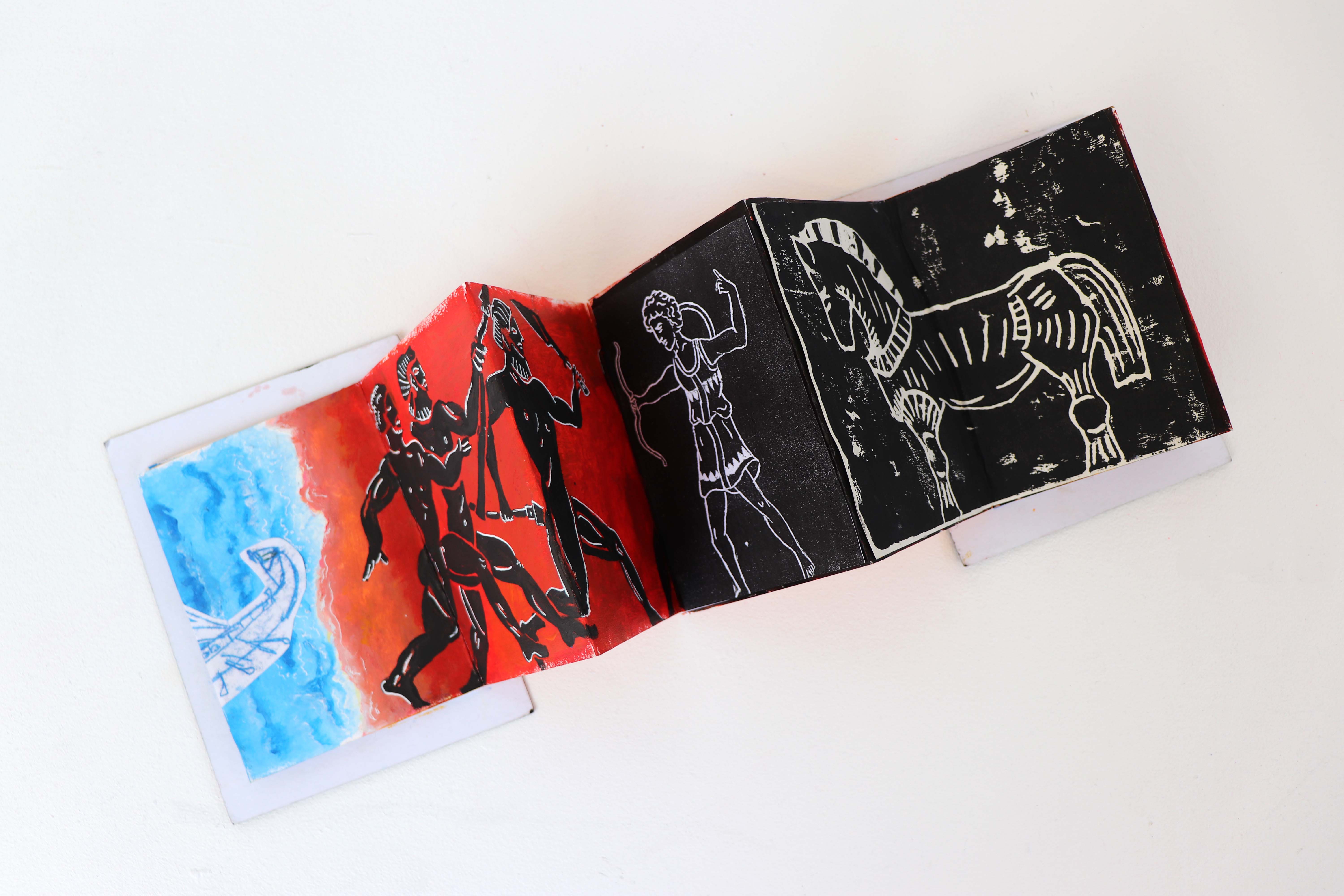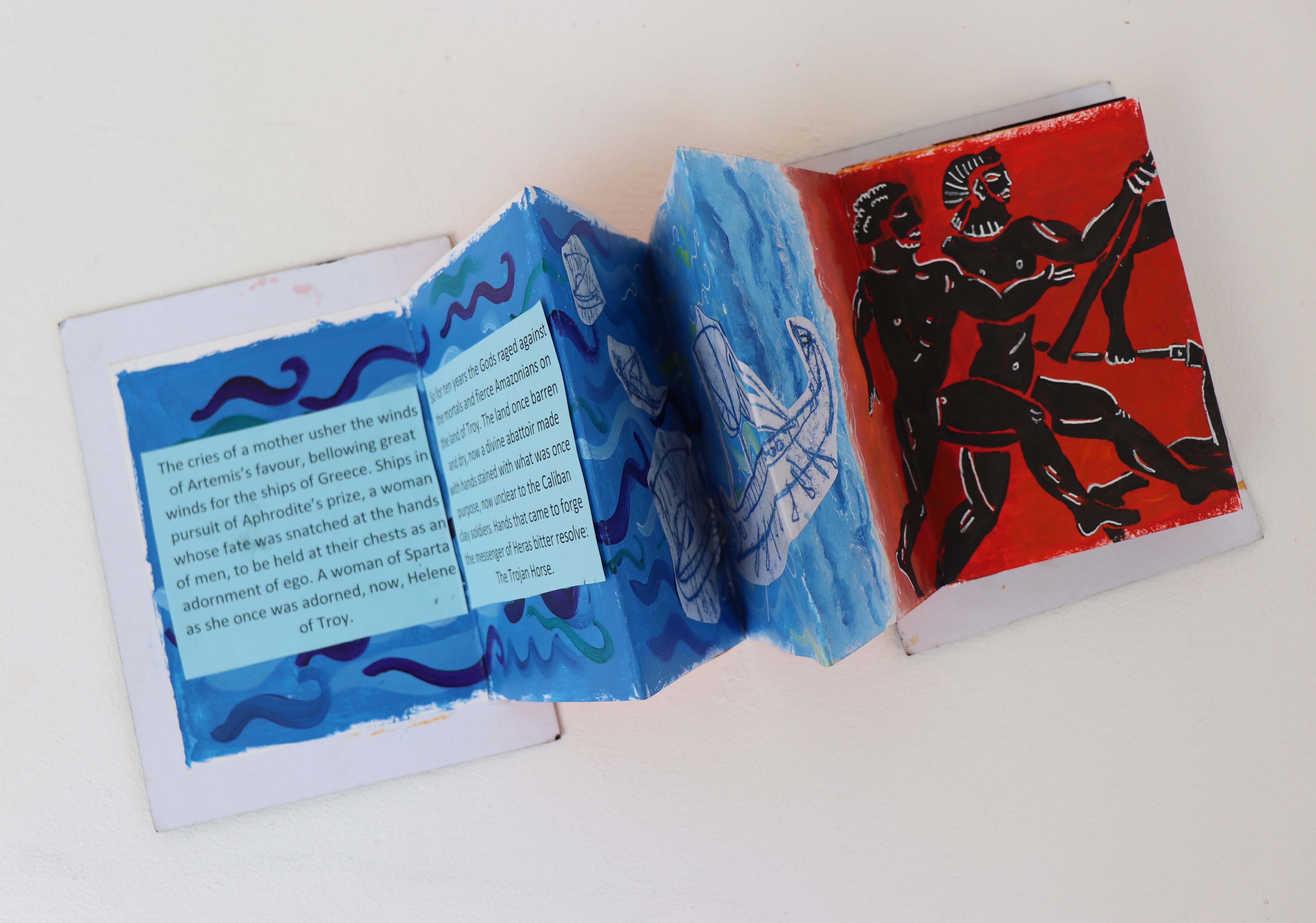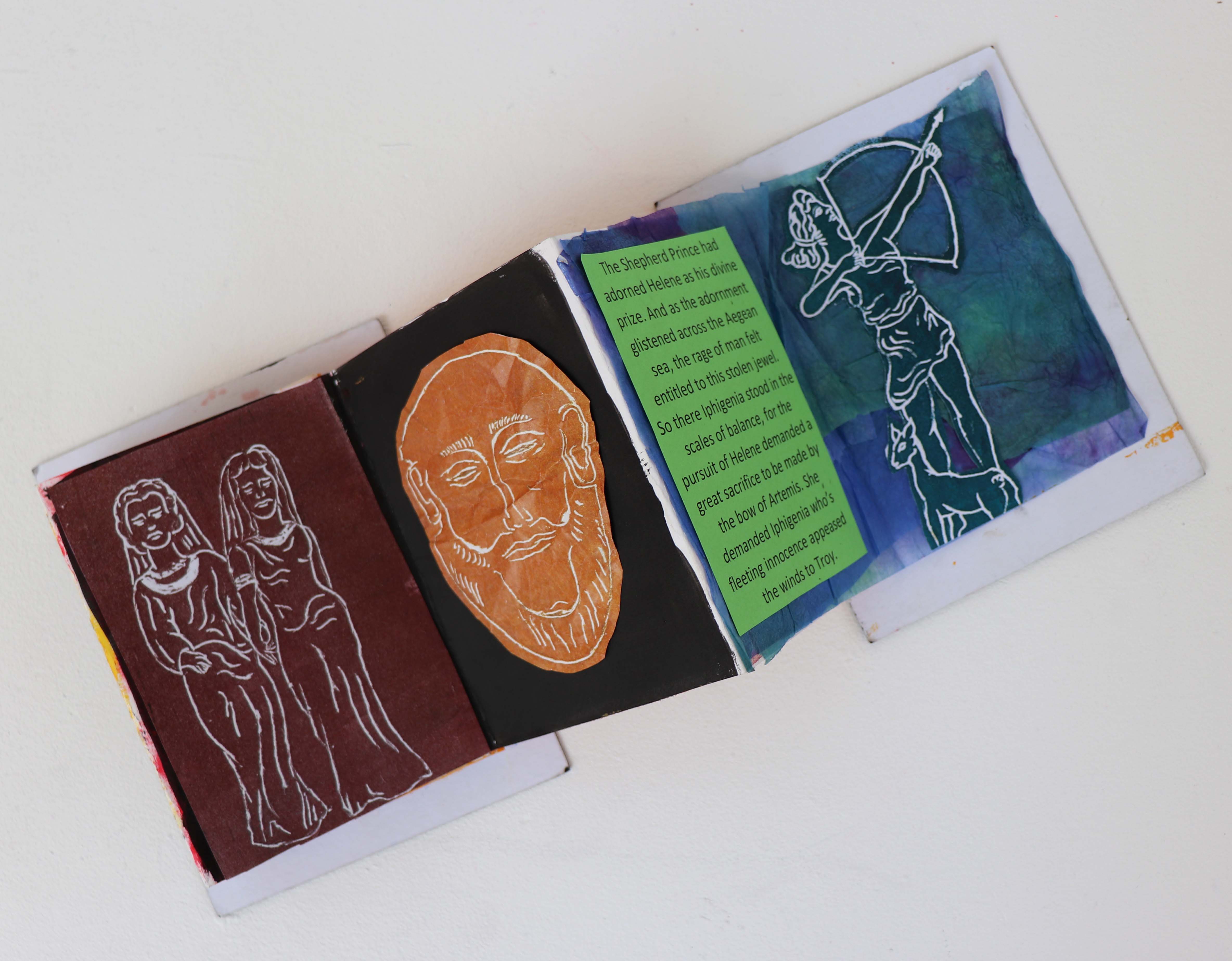 "My art work is about visualising Greek Mythology with a strong emphasis on the female perspective. I have used the Greek poem ""The Iliad"" as my narrative and main focal point throughout my project. I have reinterpreted the poem in my own words. I decided to create a hand-made concertina book and have filled the pages with a series of drawings, painting, handmade prints and my re-interpreted poetry. I have skilfully re-written the words.