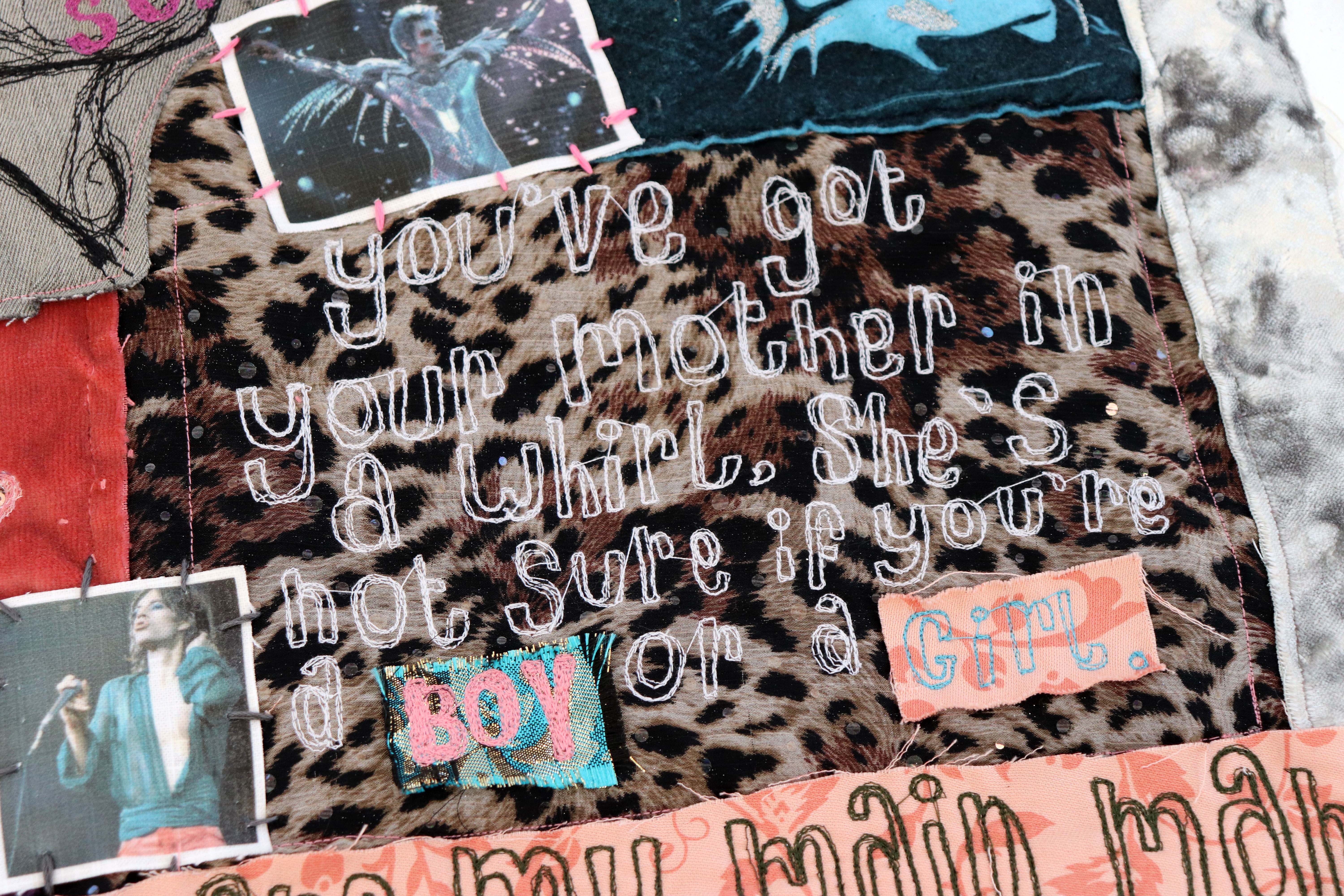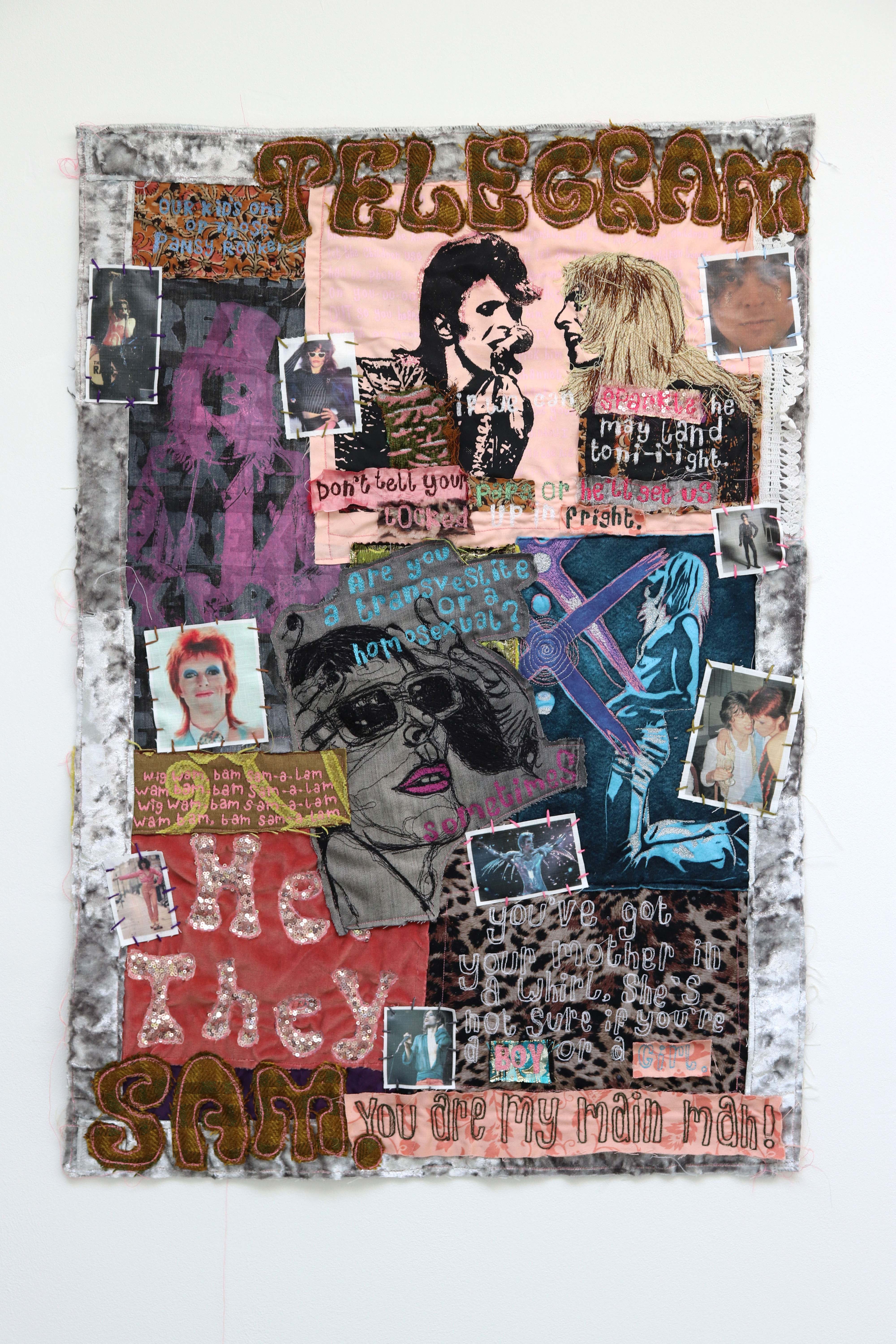For my A1 mixed media tapestry, I have showcased a range of printed imagery including: a collaged screen-print of David Bowie’s 1972 Starman performance on TOTPs, a woodcut print of Marc Bolan of T-Rex, and A lino Print of Kurt Wild from the 1998 film Velvet Goldmine. Along with machine embroidery on a range of fabrics including: a continuous line portrait of Lou Reed, Quotes and Lyrics.