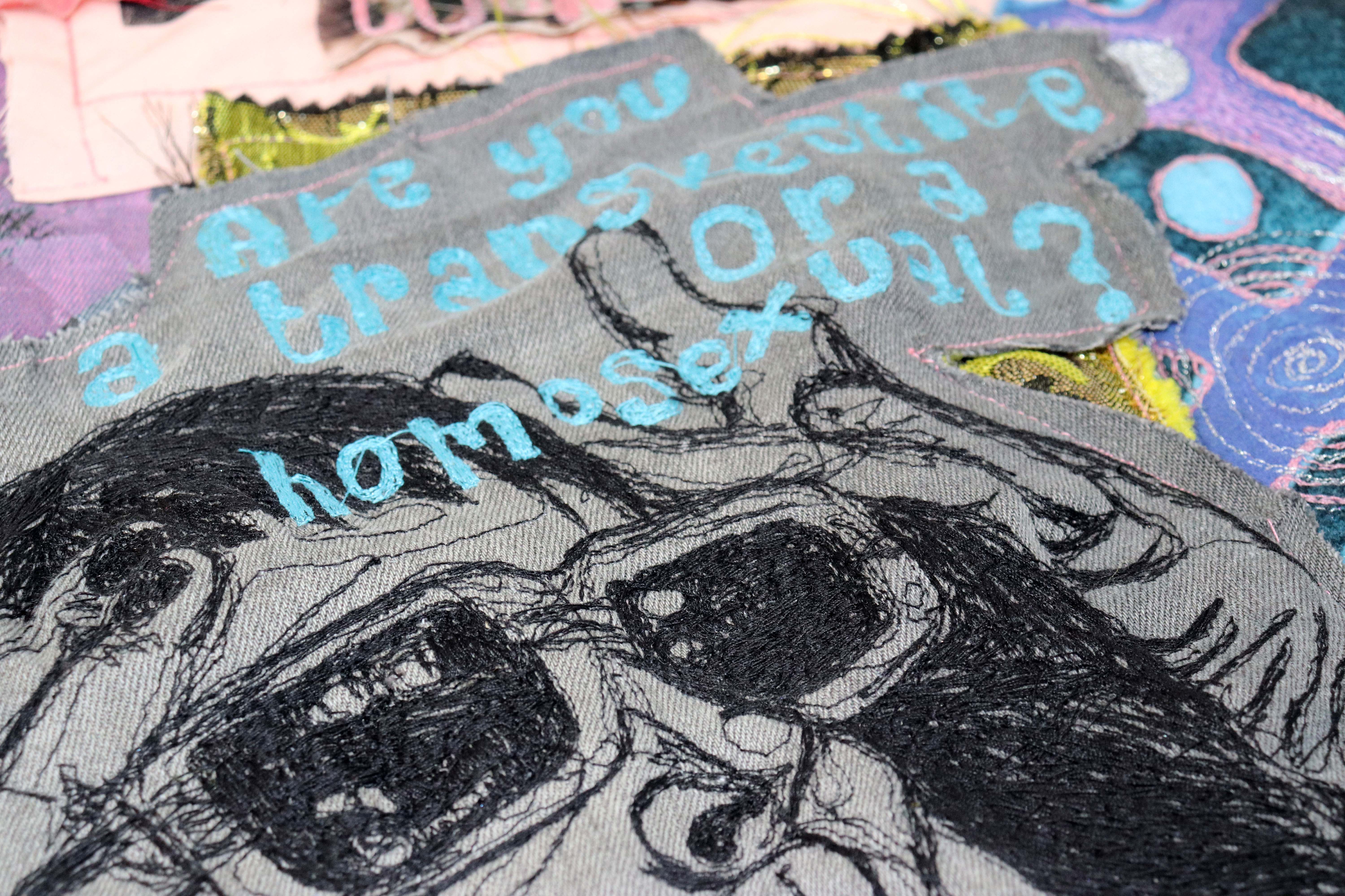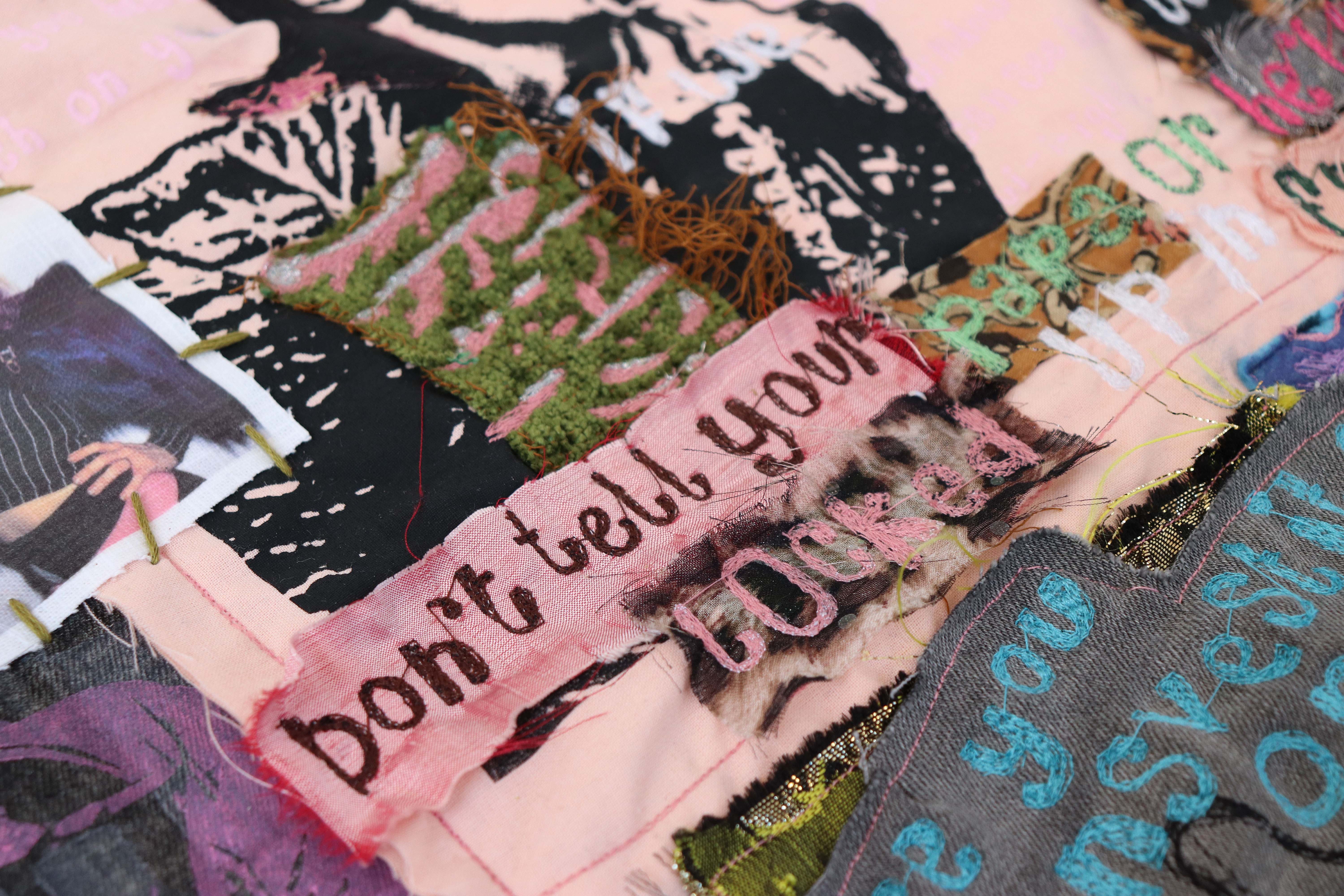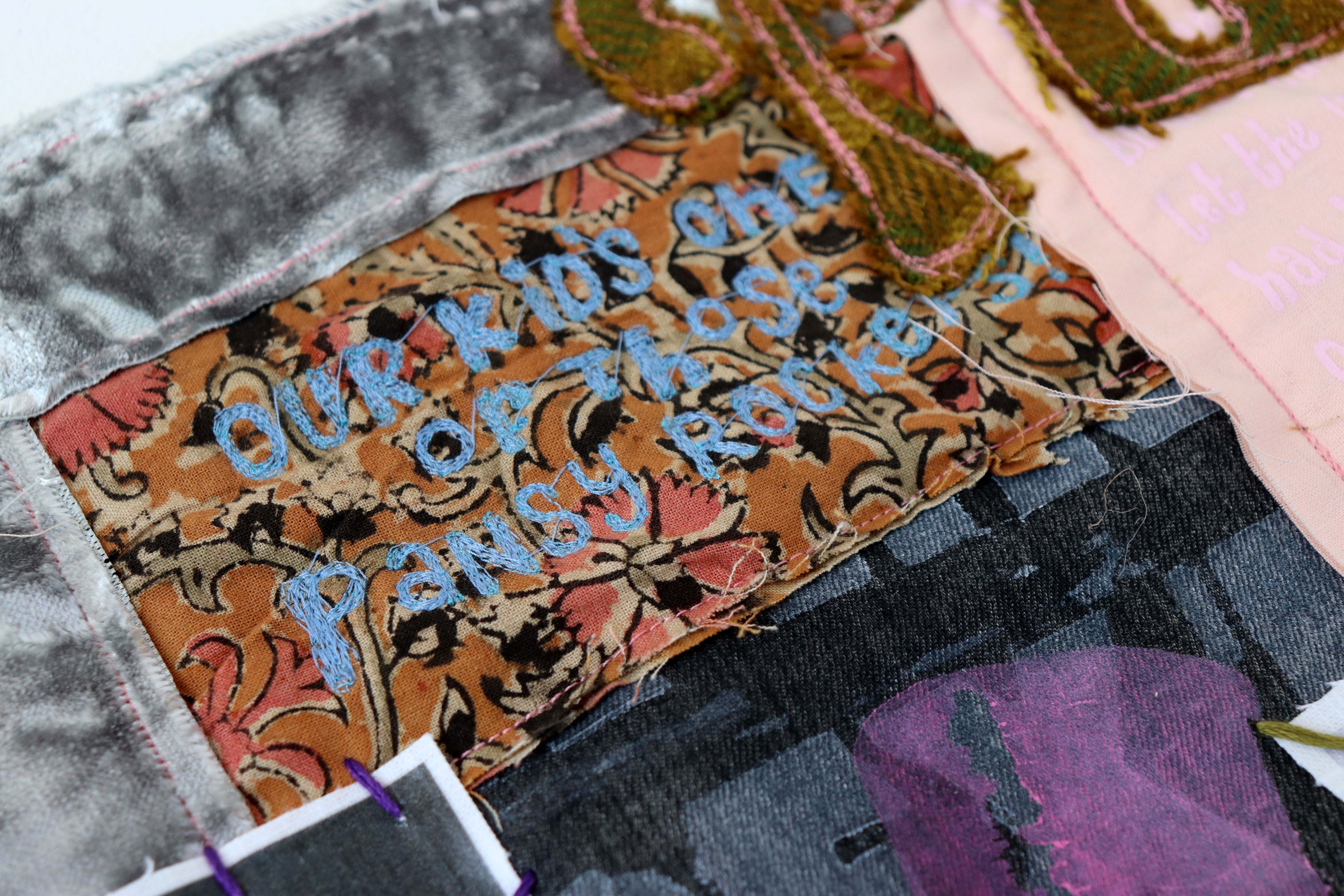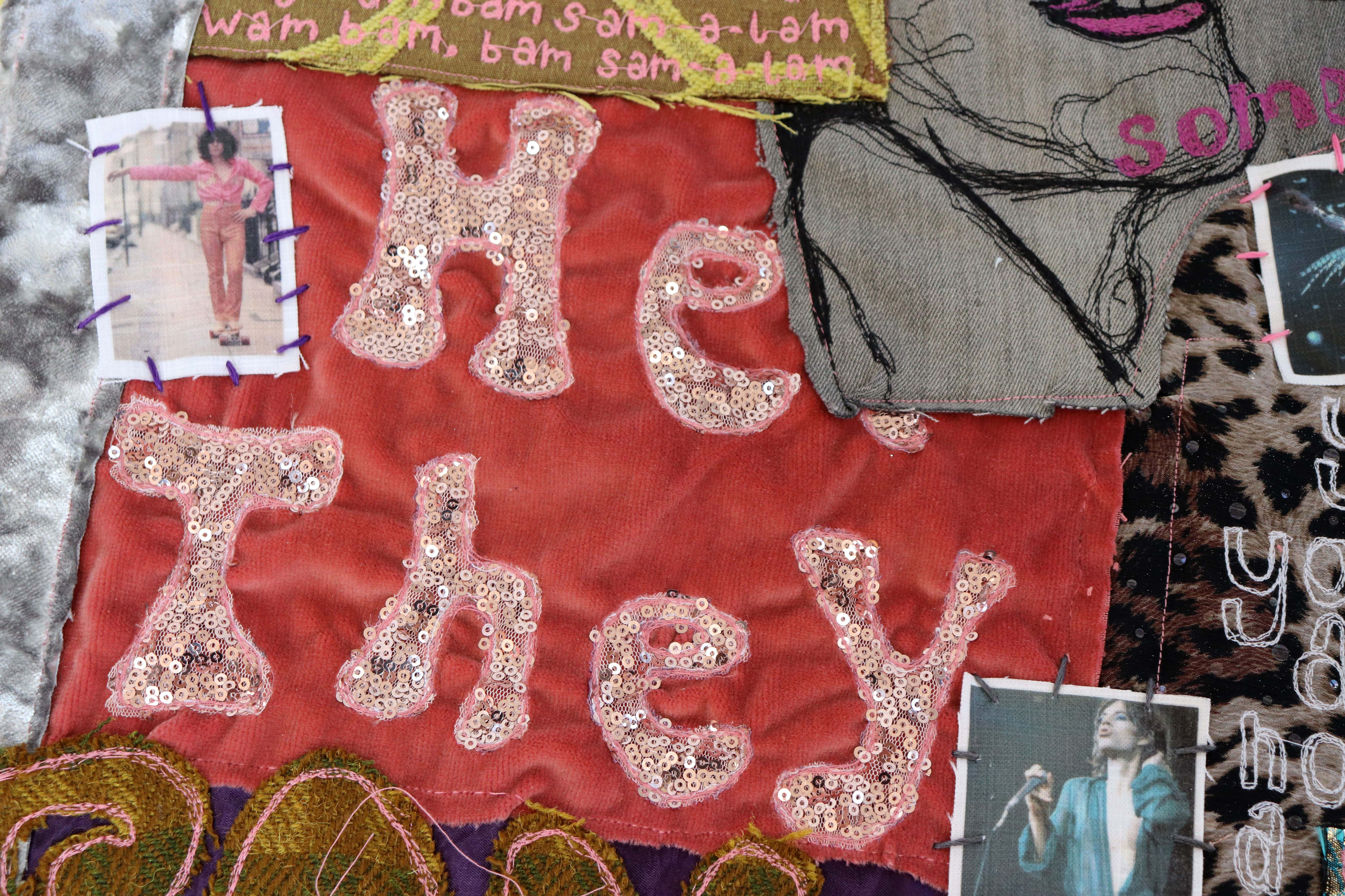 Throughout my project I researched 70’s Queer Culture, Artists and Glam Rock experimenting with different printing and embroidery techniques along the way. For my final piece I created a Tapestry inspired by the Aids Memorial Quilt which was a huge collaborative piece made in the 80’s to celebrate the lives lost during the Aids pandemic.