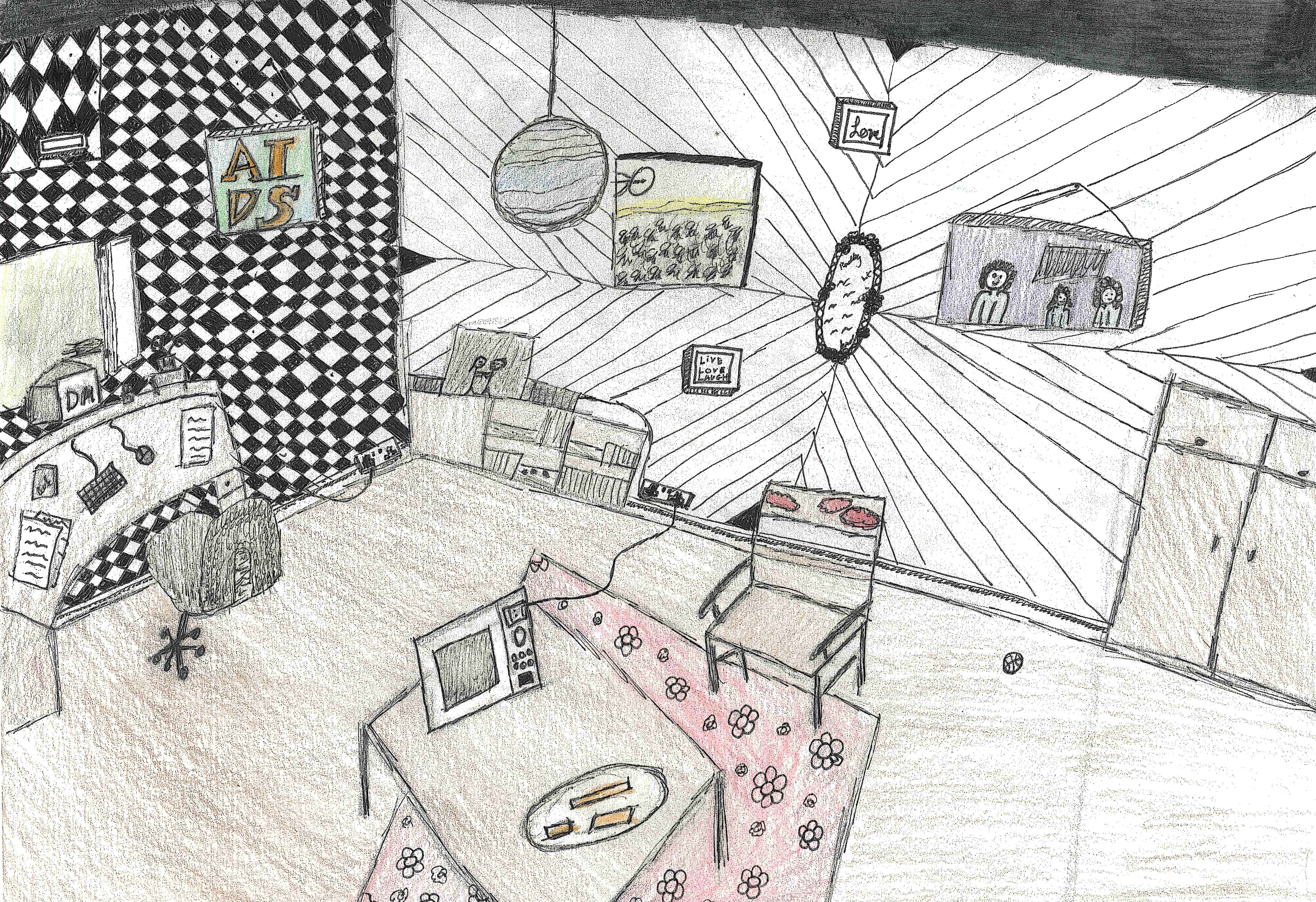 My project theme is based on my bedroom. I started with primary photographs of my bedroom and then made line drawings reflecting different spaces in my room from life and photographs, working with pencils and fine liner. I then started to create mixed media collage pieces with cut up magazines and drawing media .I explored scale and decided to focus on a series of small-scale pieces.