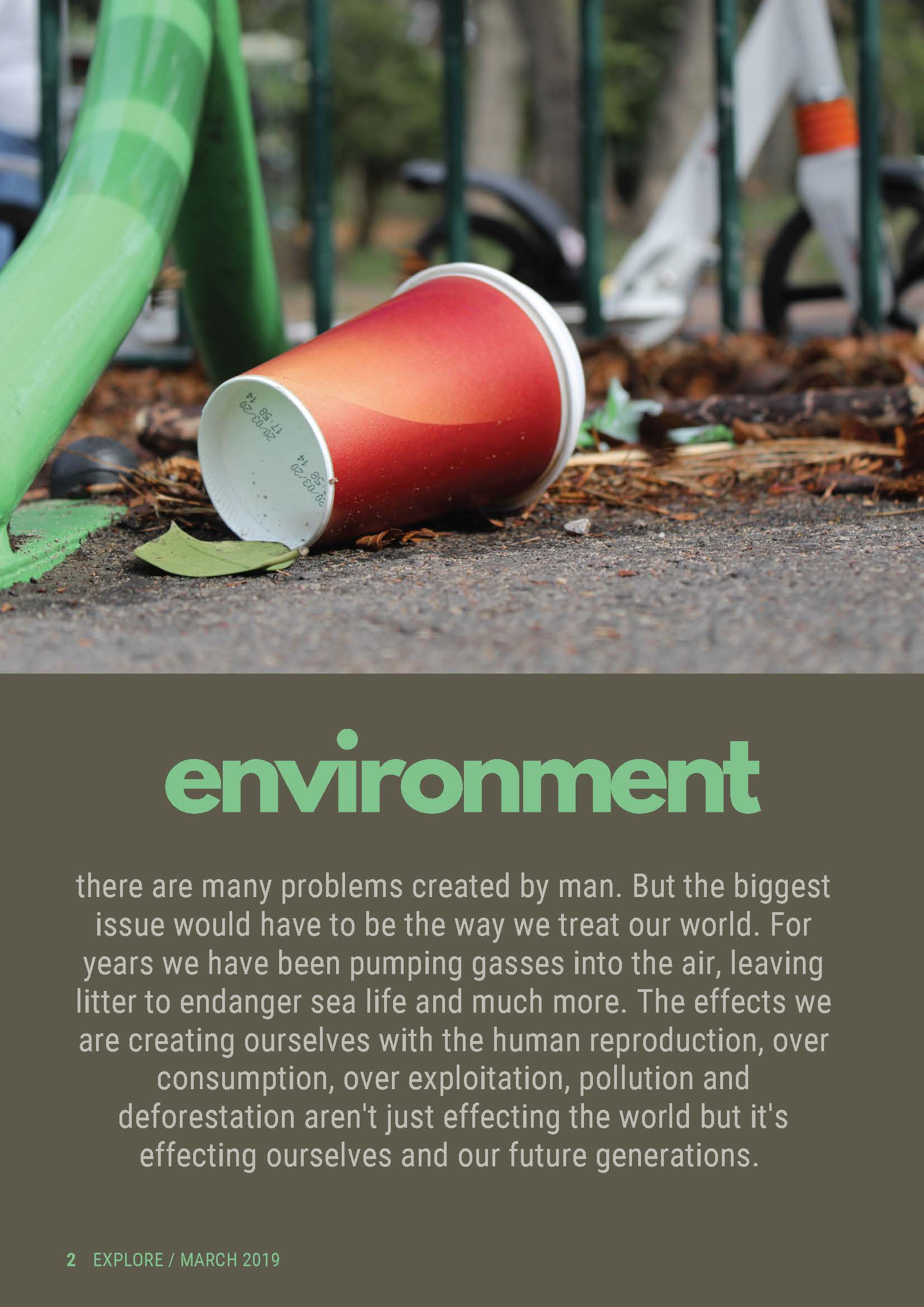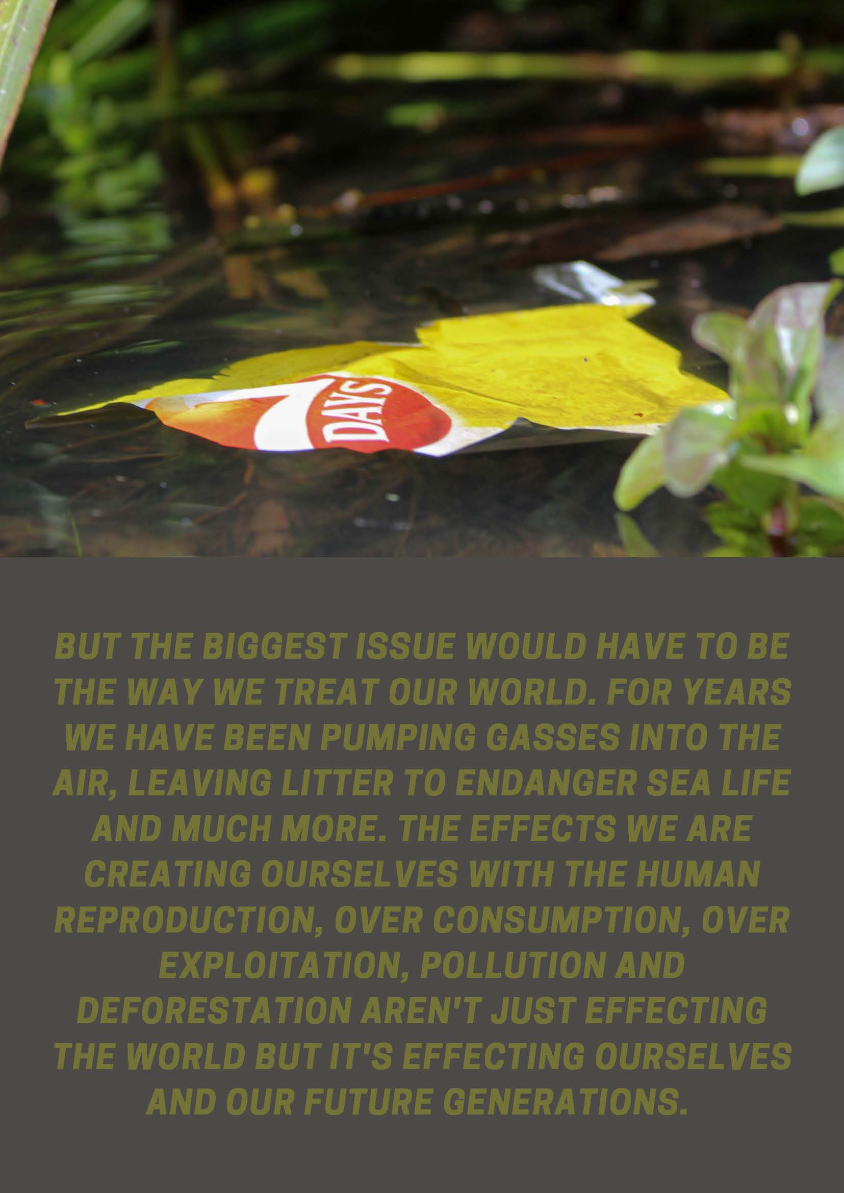 Introducing Abbey’s final major project, in this blog it will include her work based around a social documentary 'effects of humans'. Social documentary photography provides honest and accurate representation of people, places, objects and even events. It has the aim to draw the public’s attention on ongoing social issues, as well as recording what the world looks like with a social or environmental focus. With this she produced work that links to topics such as environmental issues and the future impact it will cause. Abbey has created an in-depth documentary showing off the effects of humans by taking photos of the littering and environmental problems caused by us.